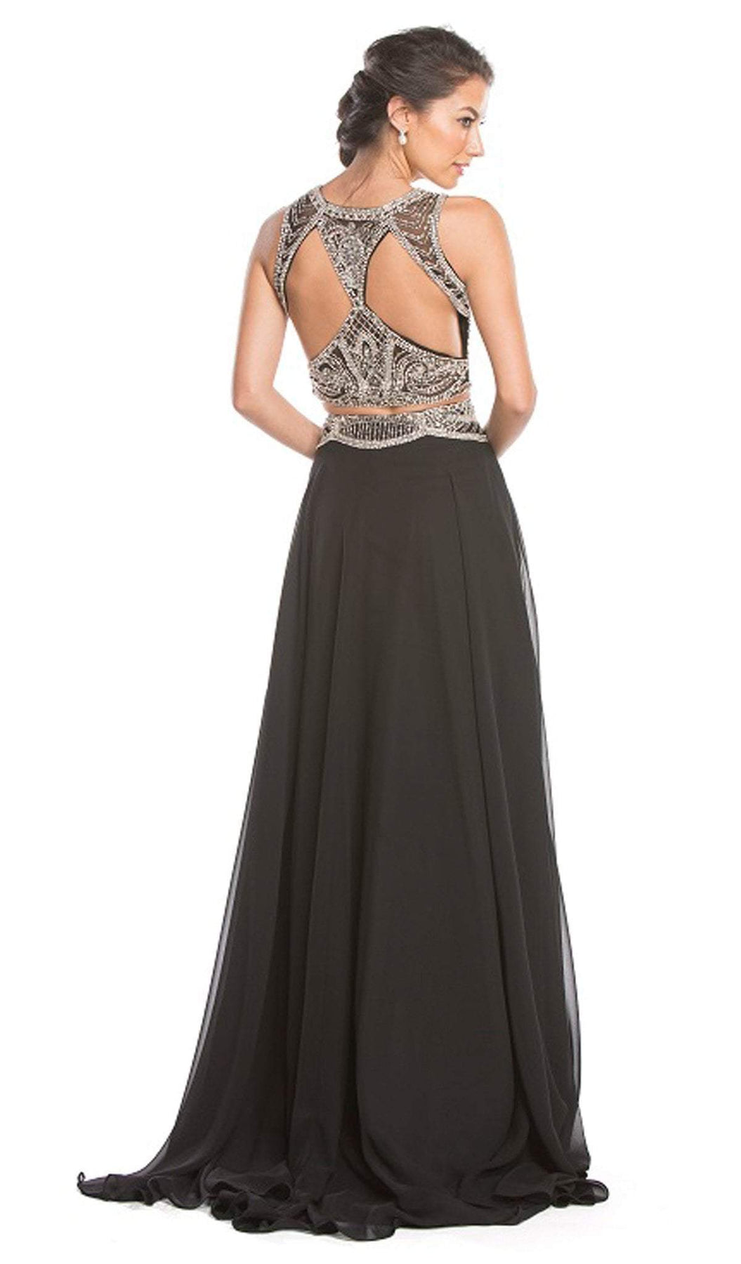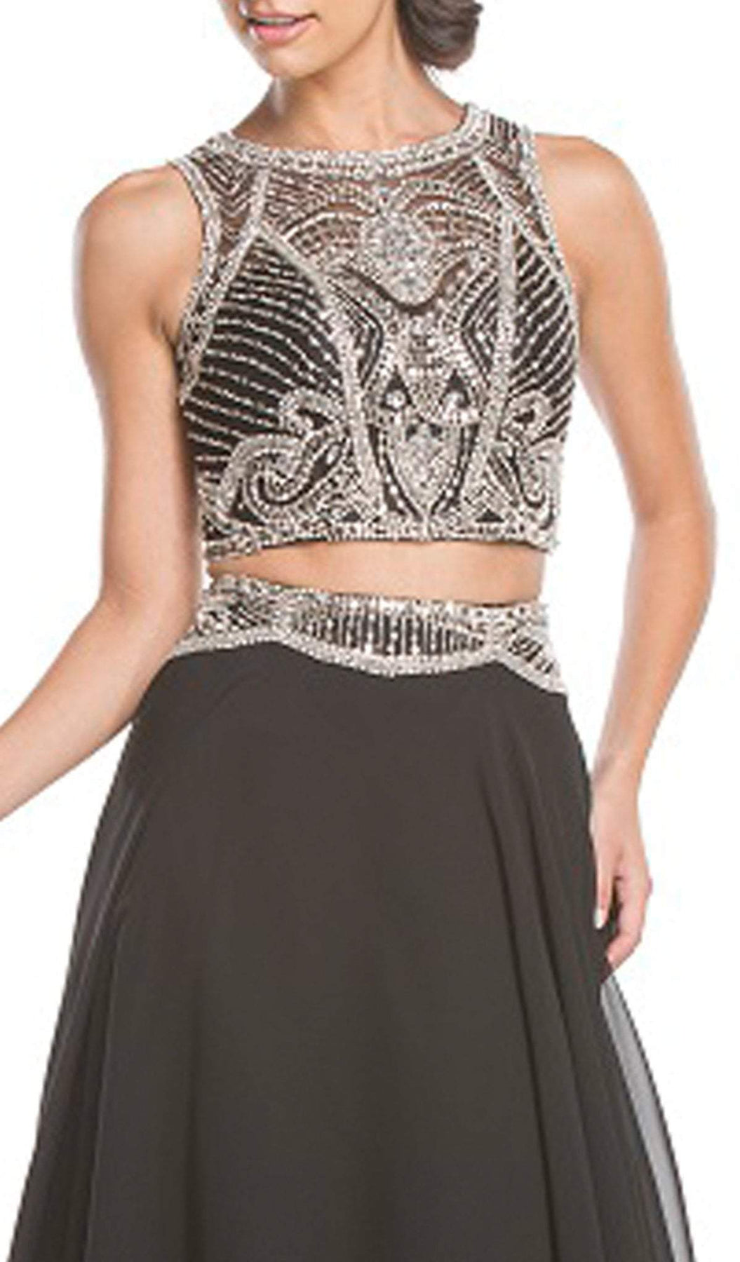 Embrace a wonderful evening in this wondrous creation by Trevi Collection L1665. Glamorous crafted in a two-piece set, this dress features an intricate beadwork embellishment on the cropped bodice and waistband. It features a bateau neckline and sexy cutout back. The flowing skirt displays an A-line silhouette and runs at a full length hem. A sweep train adds a remarkable finish to this outfit. This Trevi Collection L1665 style is specially designed to make that special occasion worth reminiscing. Model is wearing the Black color.