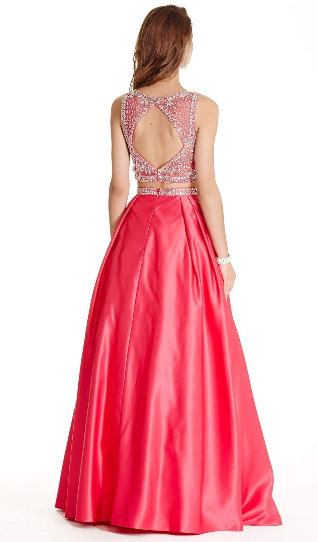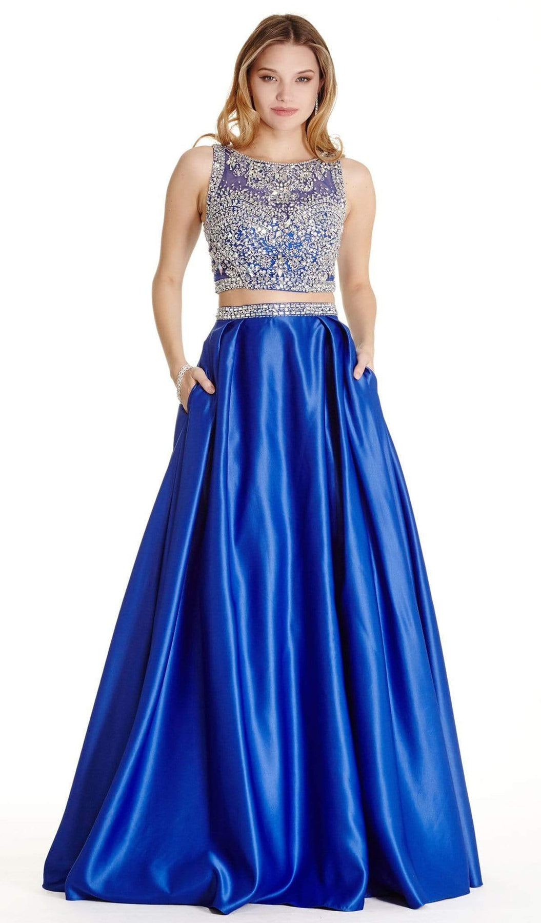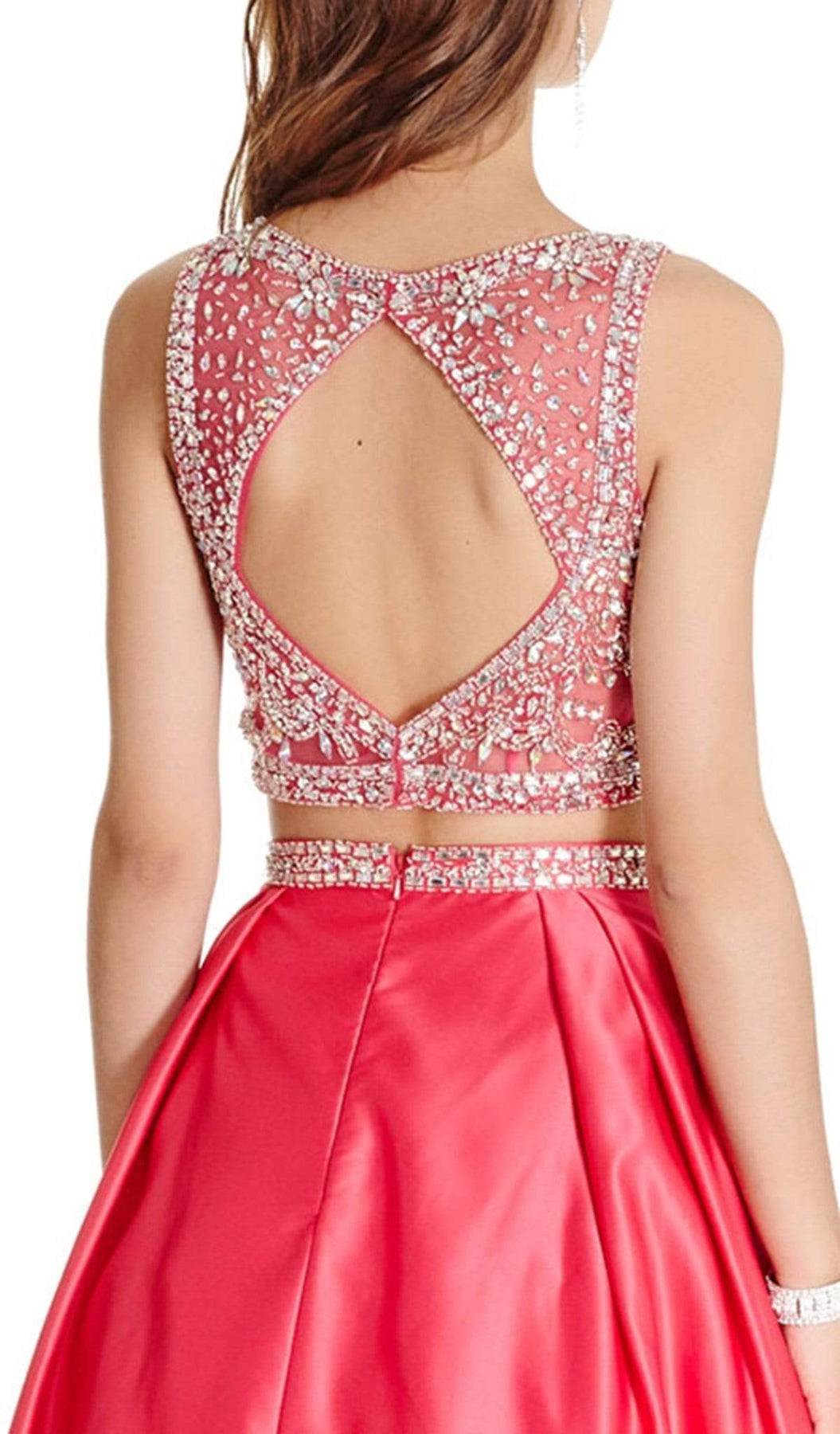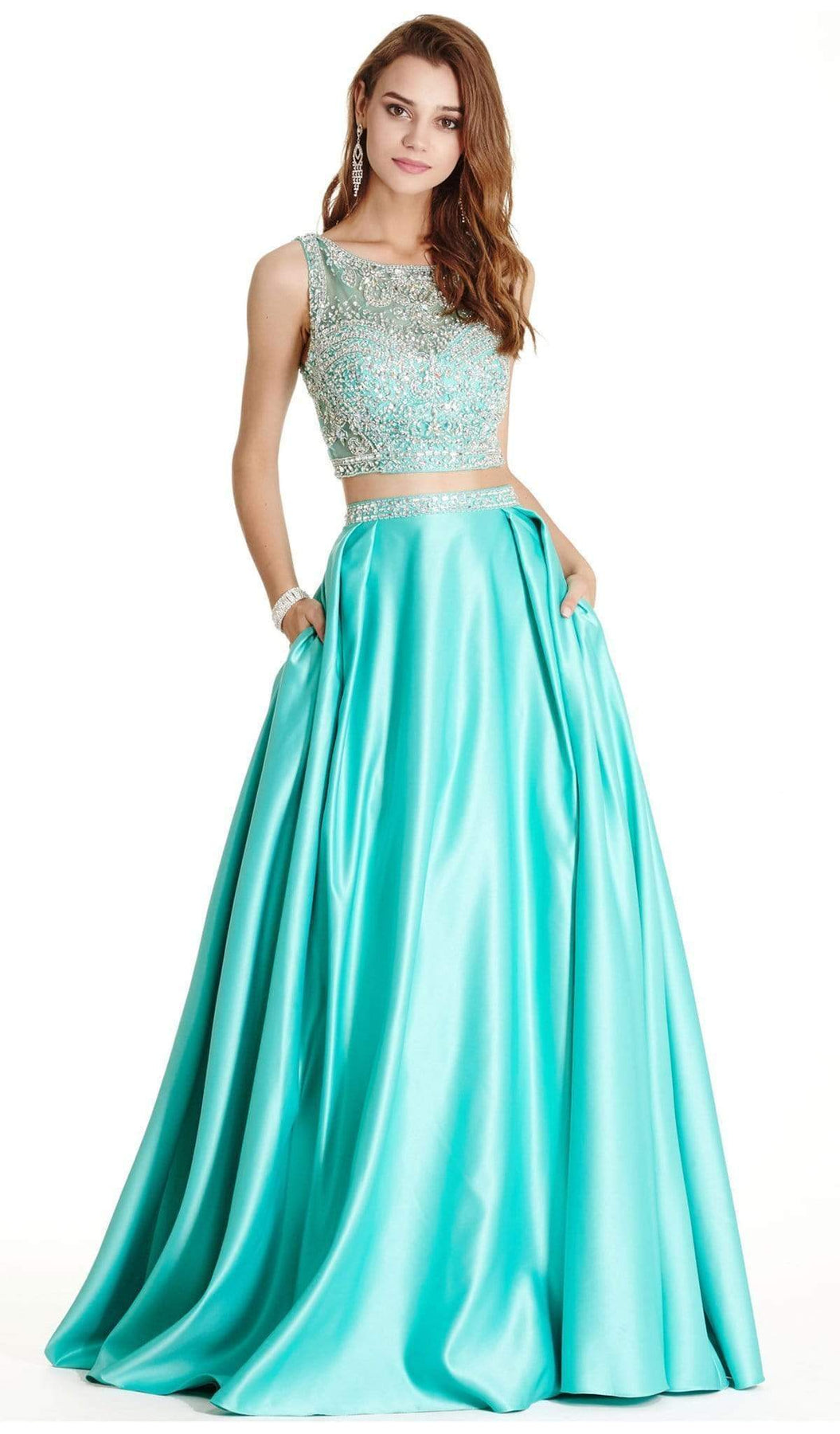 Turn yourself into a head-turning beauty by slipping into this absolutely eye-catching Trevi Collection L1689 creation. Charms in a two piece-set, this style has a sleeveless crop top bodice with a beaded embellishment, illusion bateau neckline and a diamond cutout back. Accented with beaded waistband, the pleated skirt has a side pocket for convenience and flares out to a full length ballgown silhouette. This Trevi Collection L1689 gown is perfect for prom, pageant, or a black tie event. Models are wearing the Fuchsia, Jade and Royal colors.
