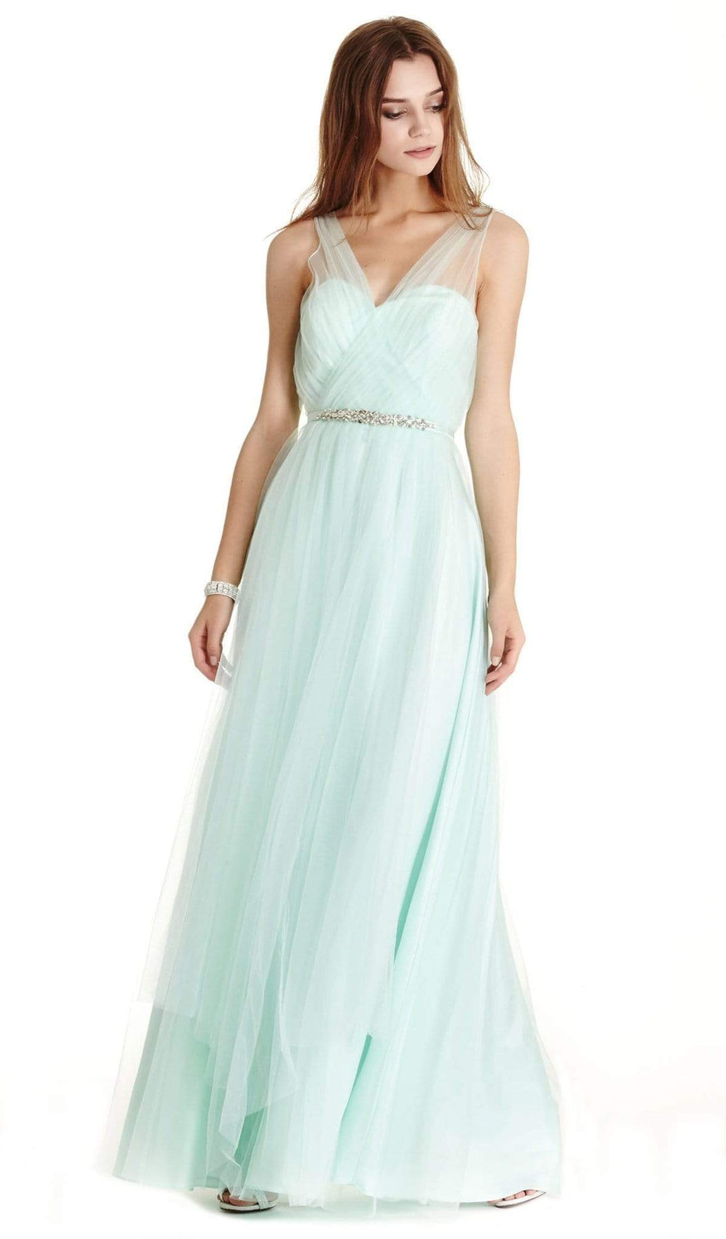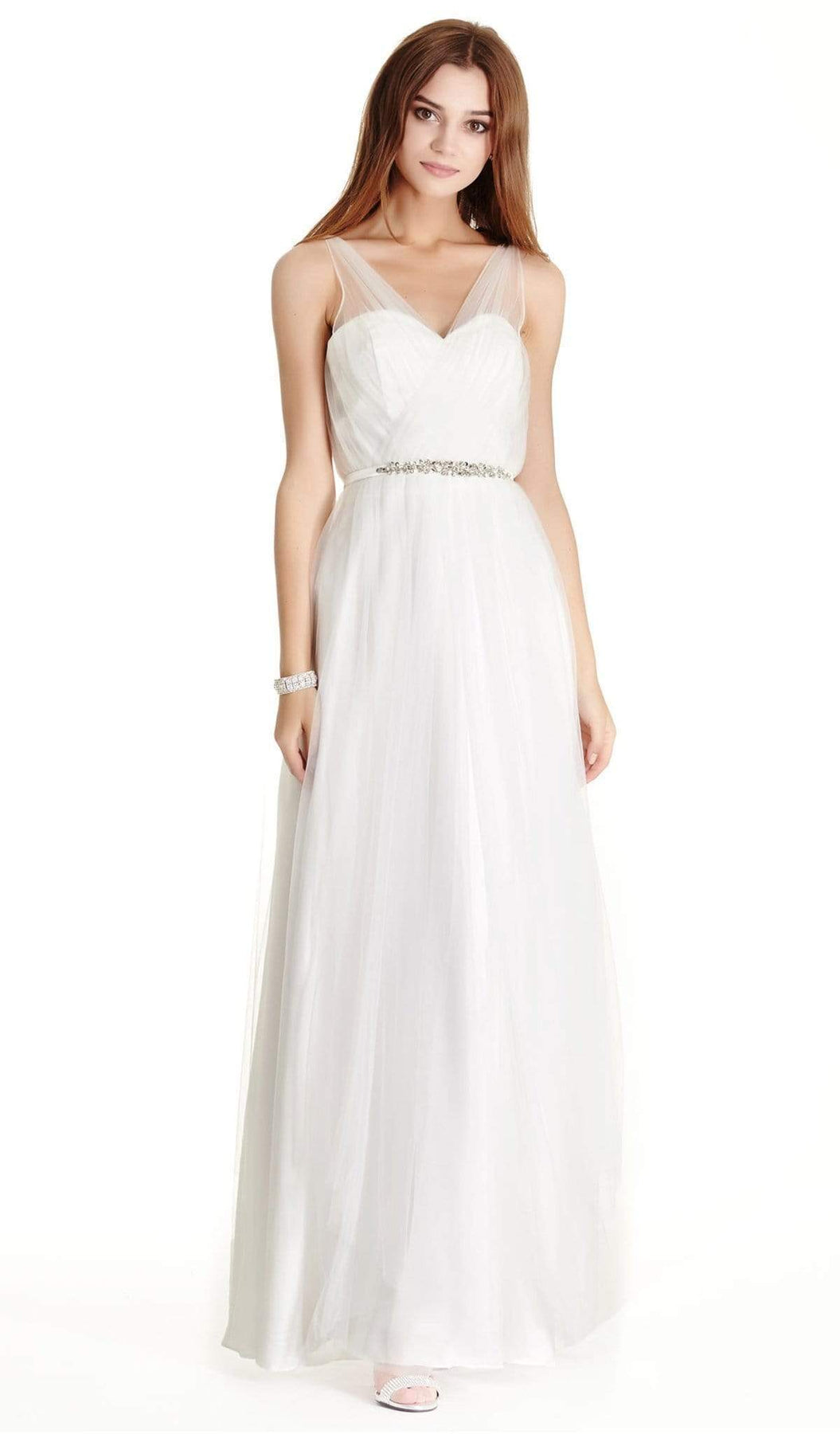 Feel glamourous in this classy Trevi Collection L1750 creation. Fashions a sleeveless, illusion V-neckline with sweetheart lined bodice cinched in a thin embellished belt. From the waist forms a full length A-line skirt for that elegant finish. Make your perfect day blossom with a promise of forever in this Trevi Collection masterpiece.