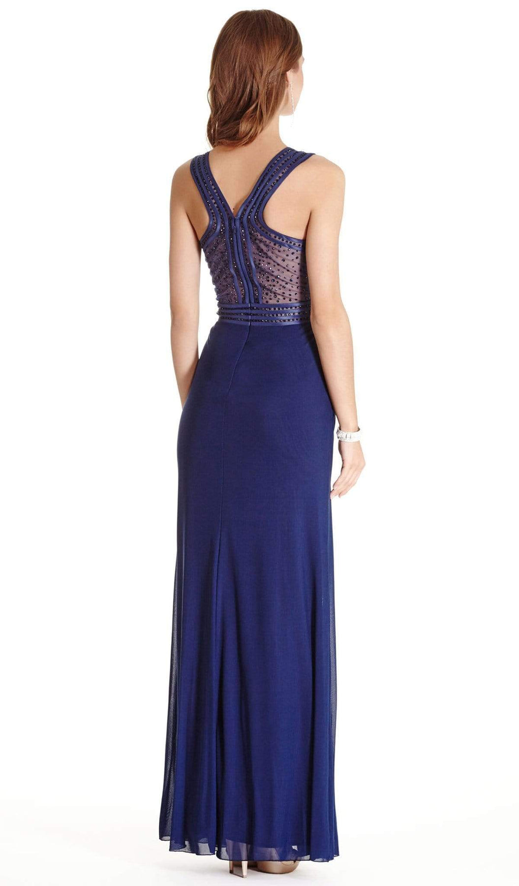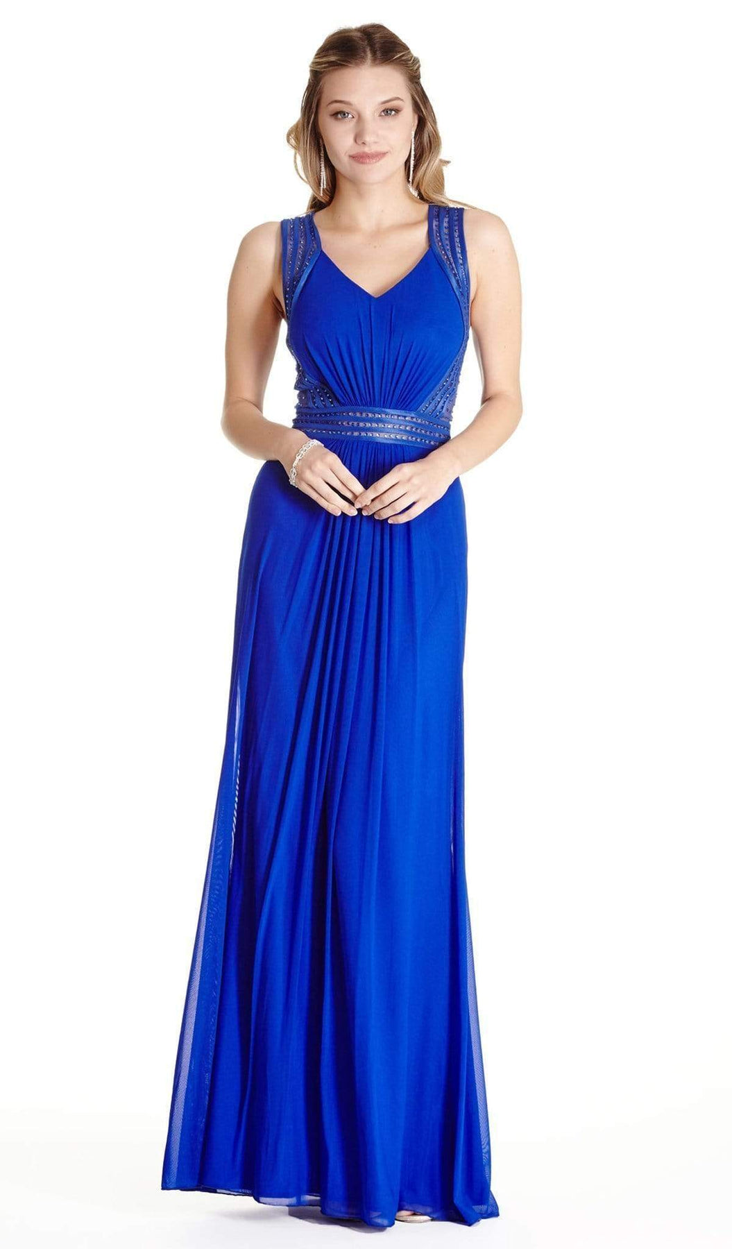 Set a style that would engage everyone in this enchanting evening in this Trevi Collection L1797 creation. Exquisitely detailed with ruching and beaded embellishment on the sheer panel, this style flaunts a v-neckline, wide shoulders straps and a sheer racerback. The gathered skirt showcases a sheath silhouette and flows to the full length hem. This Trevi Collection L1797 dress gives you an intricate look that will last a lifetime. Models are wearing the Navy, Red and Royal colors.