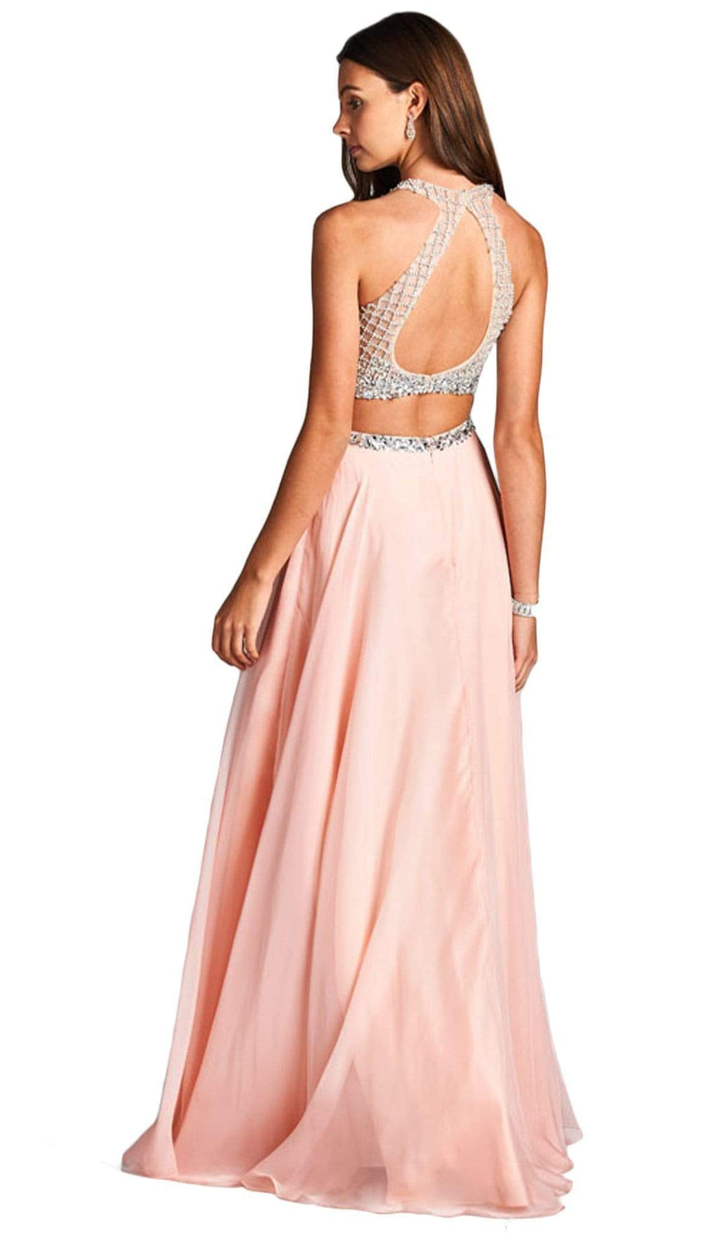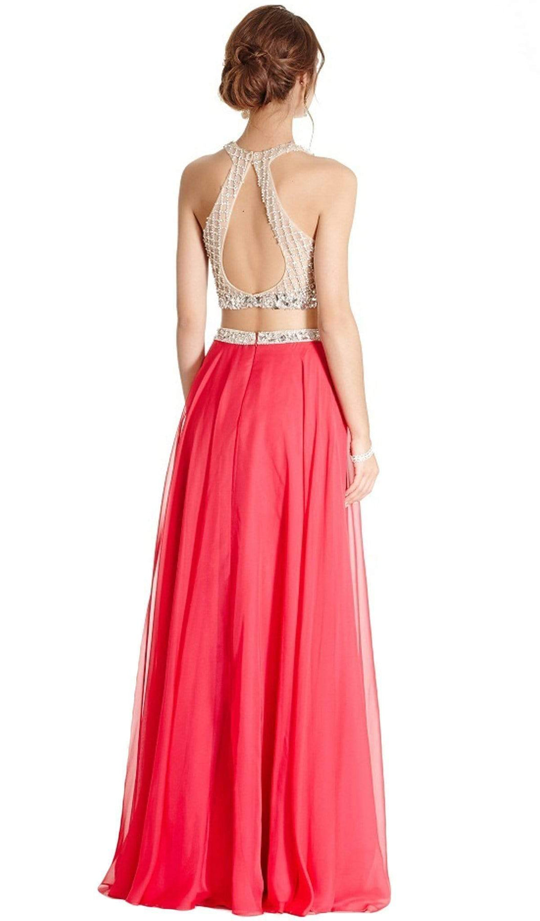 Get ready to flaunt your fabulous figure when you walk the red carpet wearing this eccentric creation by Trevi Collection - L1867. This stunning two-piece dress features a crop top with a sleeveless illusion halter neckline and an open back. It is beautifully embellished with sparkling embellishments for an enchanting effect. The A-line skirt cascades from the waist to a full length hemline. Level up your glamorous style while dancing the night away in this stunning masterpiece by Trevi Collection - L1867. Models are wearing Fuchsia and Jade colors.