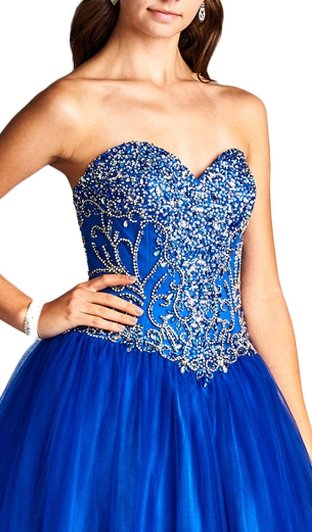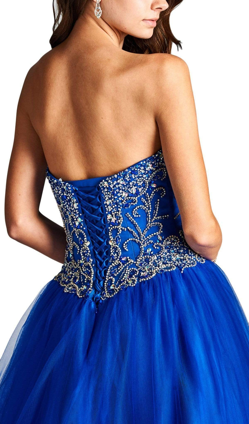 This masterpiece by Trevi Collection L1895 will definitely parade your elegant and classy style on your next formal occasion. This ethereal dress shimmers and shines with jewel embellishments. It is designed with a sweetheart neckline on a fitted embellished bodice. It reveals an open back with a lace-up closure for a perfect fit. Starting from its basque waistline, the voluminous skirt flourishes to a ball gown silhouette as it cascades to a full length hemline. You will surely be the loveliest of them all when you show up to your event wearing this ravishing creation by Trevi Collection L1895. Model is wearing Royal color.