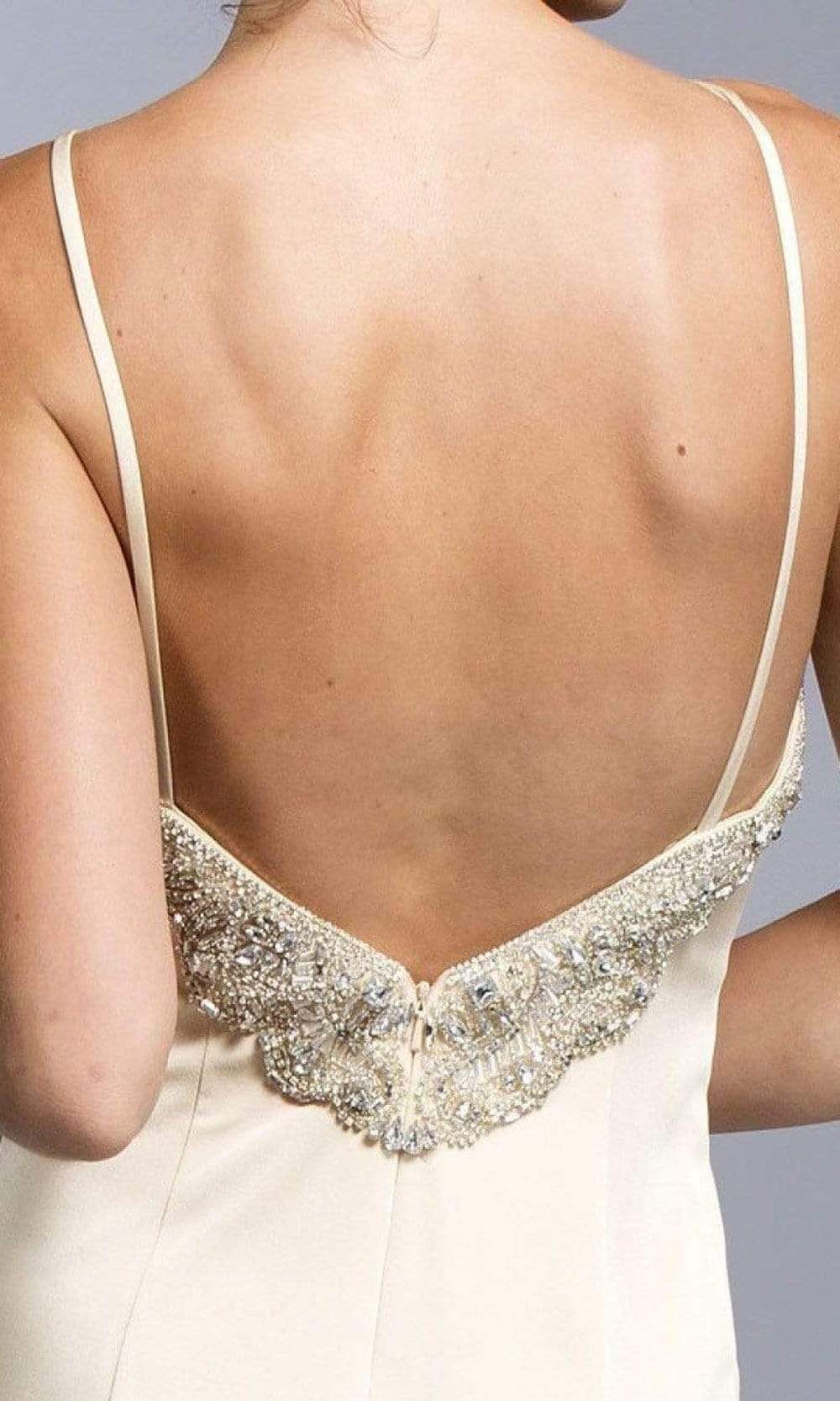 Wearing this Trevi Collection L1938 evening gown, you will walk with class and style. Walk elegantly while wearing this look by Trevi Collection to show off your sophisticated style. This dress features a V-neckline supported by thin straps in a sleeveless bodice. The skirt has an A-Line silhouette, an appliqued open back, and a back zipper closure. In this Trevi Collection L1938 creation, you can express your distinct persona of classic sophistication. The model is dressed in Champagne.