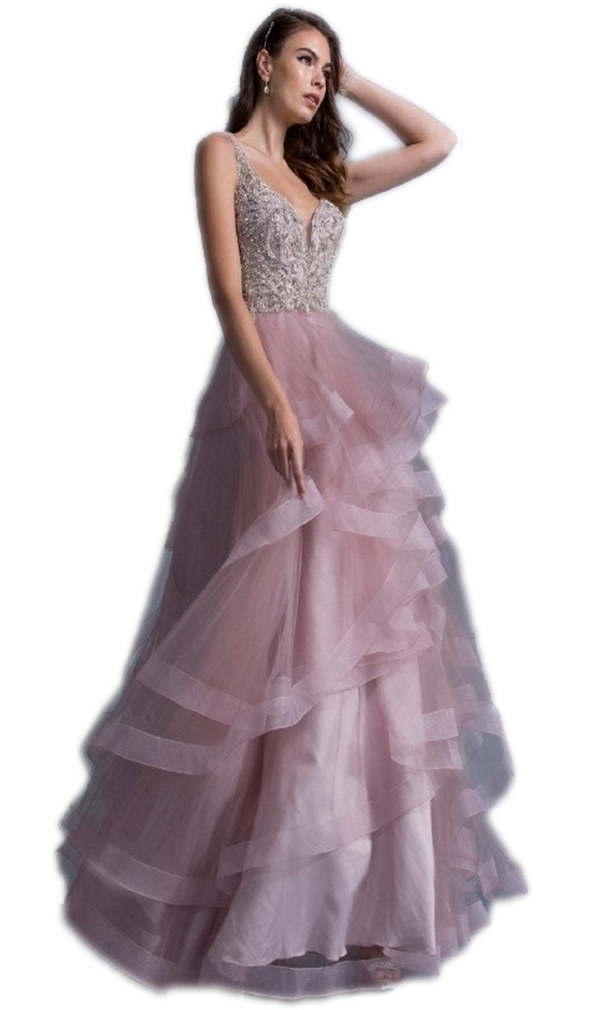 In this charming Trevi Collection L1973, you will captivate everyone. This stunning gown features a sleeveless, plunging V-neckline with a sheer inset at the mid-bust. The adorned bodice is held up by thin straps and connects to a low V-back with zipper closure. The full-length A-line skirt features cascading layers of ruffles and a horsehair hemline. Simplicity and elegance as defined by Trevi Collection. Look stunning in this Trevi Collection L1973 gown. Model is wearing Mauve color.\
