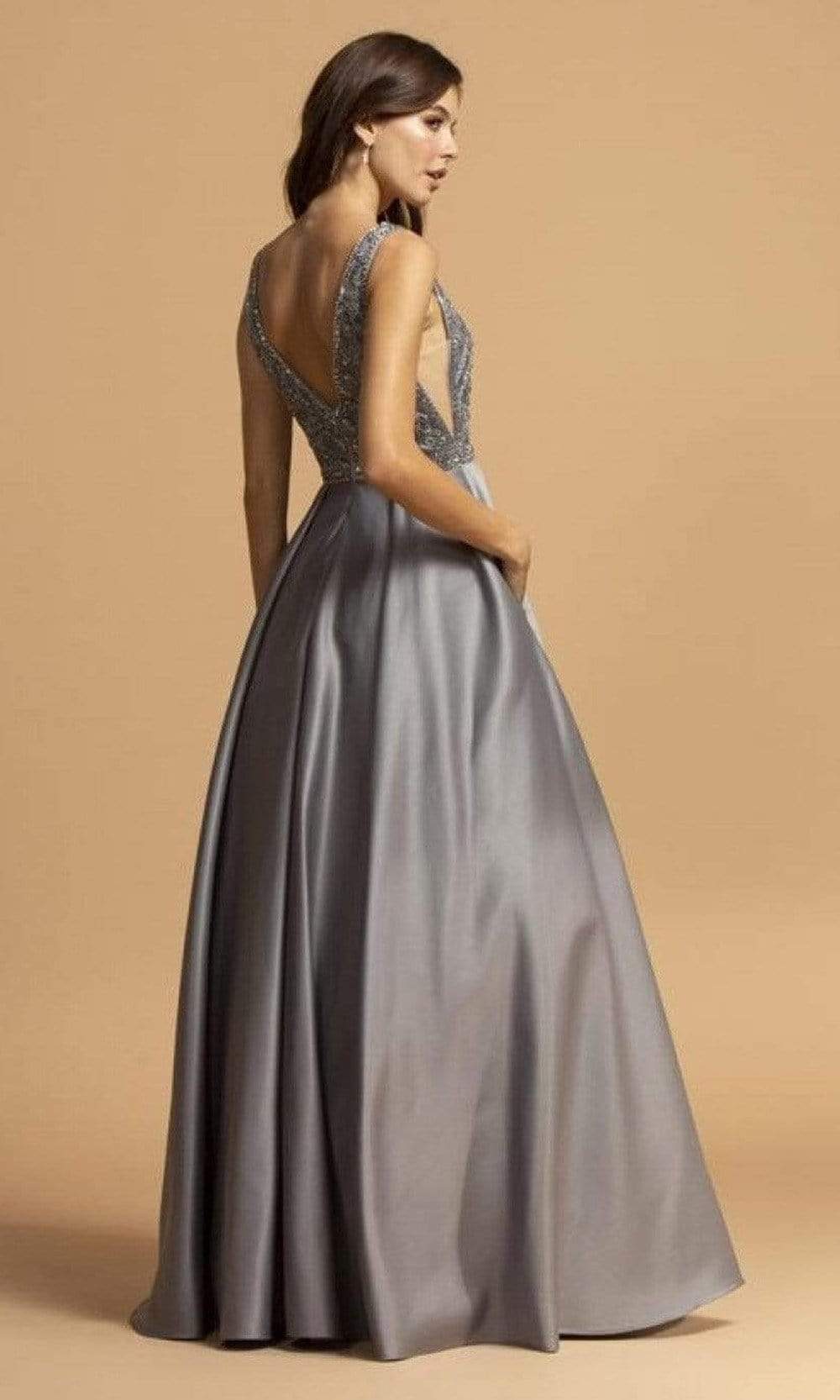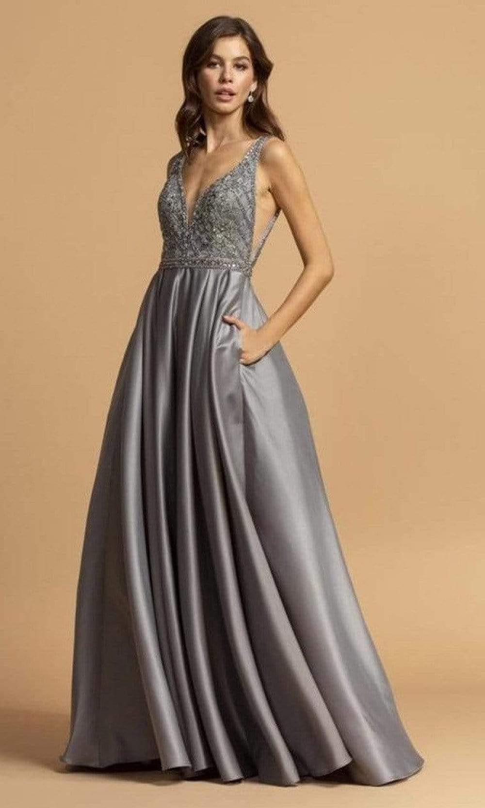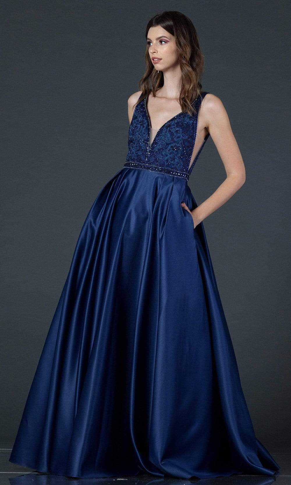 In Trevi Collection L2001, you will be a captivating beauty. A lovely sleeveless, deep V-neckline with sheer insets makes a statement. The embroidered bodice has a V-back, and a full-length A-line skirt with pockets falls from the waist to flaunt your style. You will leave everyone speechless when you walk into the room in this Trevi Collection creation. This Trevi Collection L2001 creation is absolutely stunning! The models are dressed in Mauve, Burgundy, Navy, and Silver.