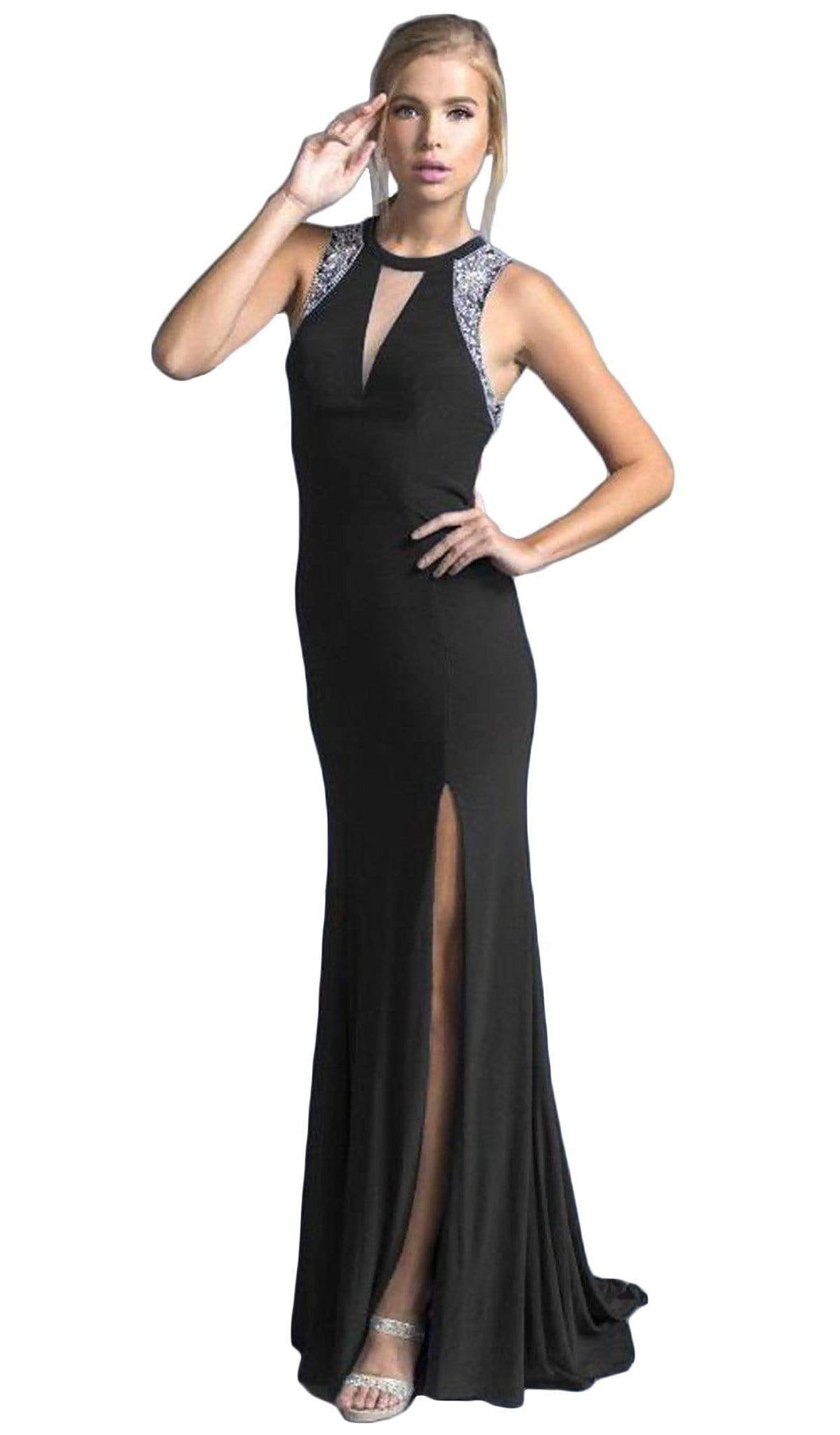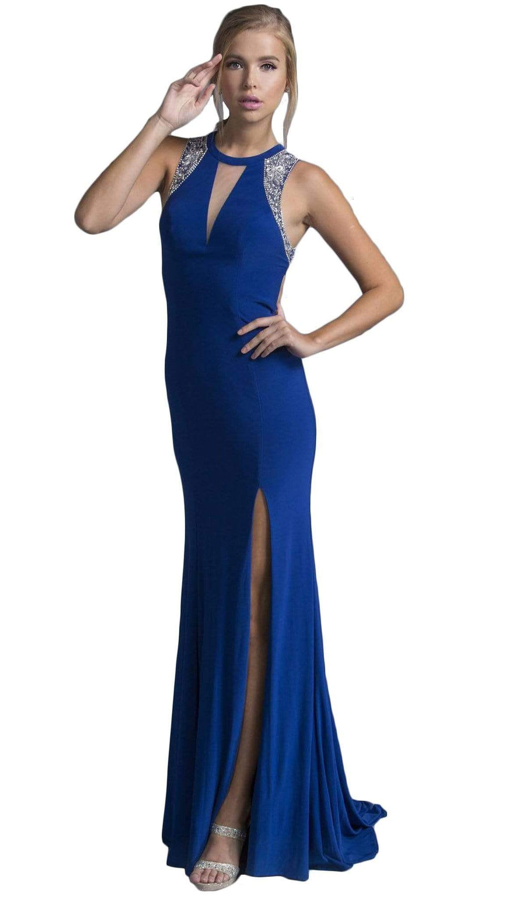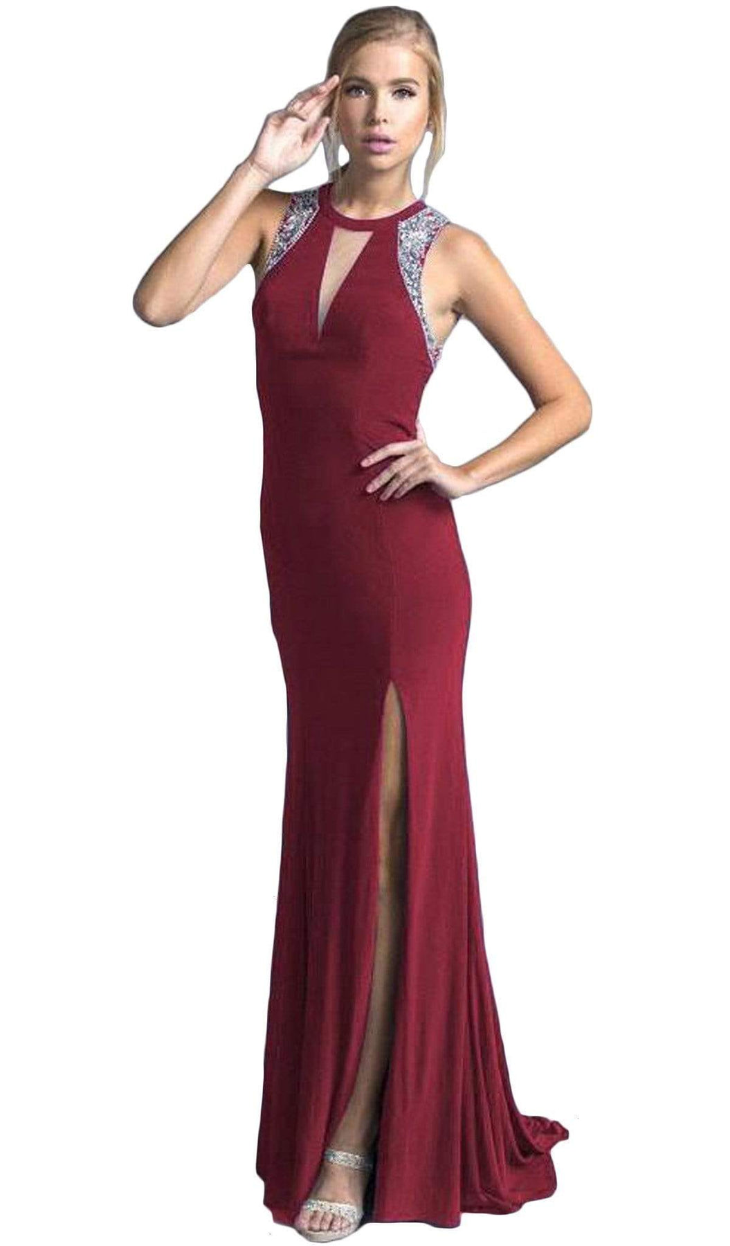 Enter the party and do that walk of a regal beauty in Trevi Collection L2008 creation. Elegantly crafted to flatter your curves, this ensemble displays a sleeveless bodice with a jewel neckline, illusion v-shaped inset and a beaded embellishment. The daring back reveals a peek of skin with its cutout design and has clasp and zipper closure for a perfect fit. The sheath skirt breaks a thigh-high slit at the side and cascades to the full length hem with sweep train. This Trevi Collection L2008 dress will sure to display your natural beauty and grace. Models are wearing the Black, Burgundy and Royal colors.