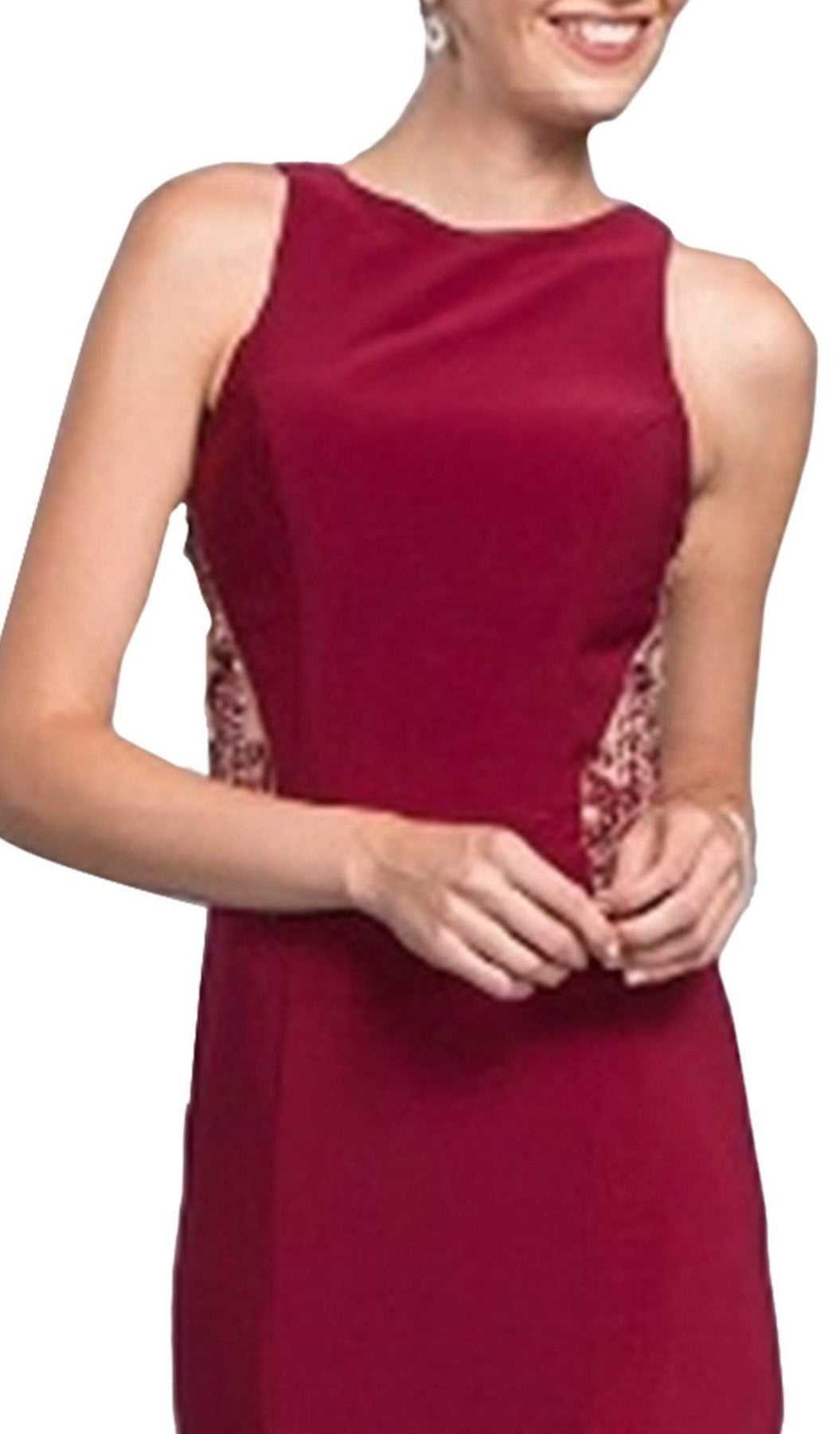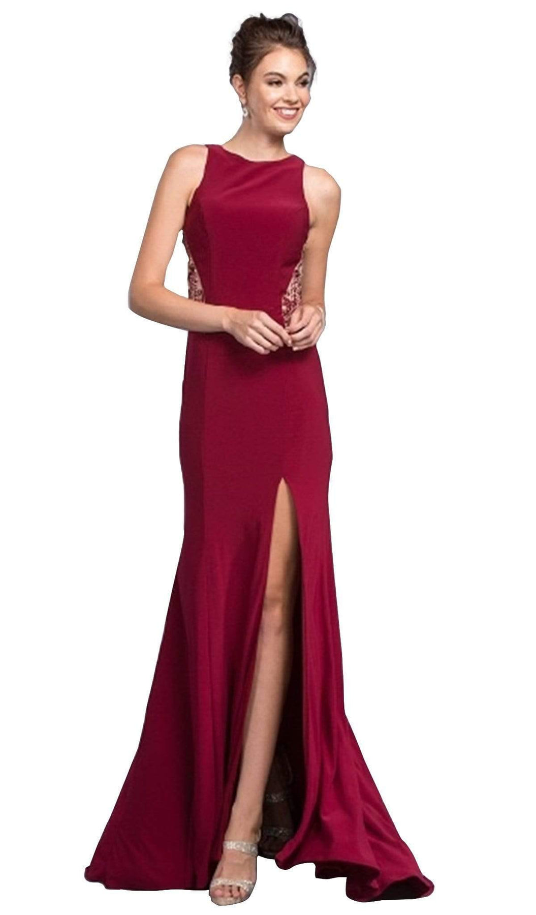 This Trevi Collection L2020 dress is a stunning blend of style and comfort that will take you from the office to the party. The dress has a sleeveless, bateau neckline and a fitted bodice with embellishments at the back and sides. The dress features a back zipper closure, a fitted skirt with a thigh-high slit, and a sweep train finish. Simplicity and elegance as defined by Trevi Collection. Step out in a stunning Trevi Collection L2020 gown. Model is wearing Burgundy color.