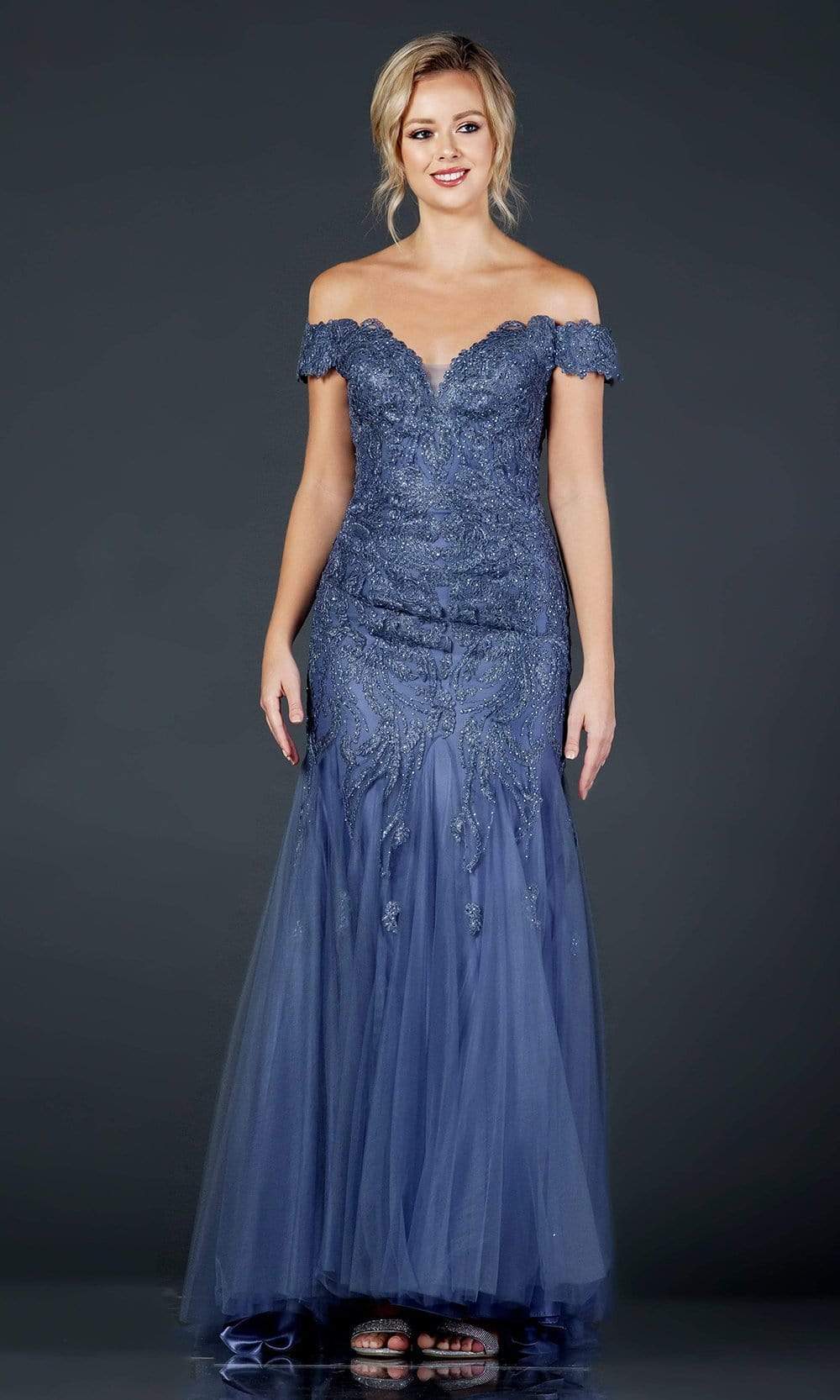 In this Trevi Collection L2091 gown, walk with seduction and style. This fabulous dress will make everyone remember you because they will notice your beauty. This stunning embroidered gown has an off-the-shoulder neckline, a fitted bodice, and a back zipper closure. The tulle skirt features a trumpet silhouette and a full-length hem. In this fabulous Trevi Collection L2091 look, orchestrate your moment to stand out. The models are dressed in Charcoal, Slate blue, and Blush.