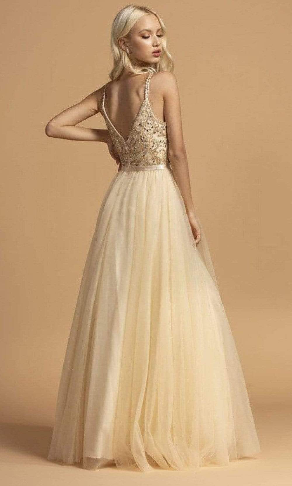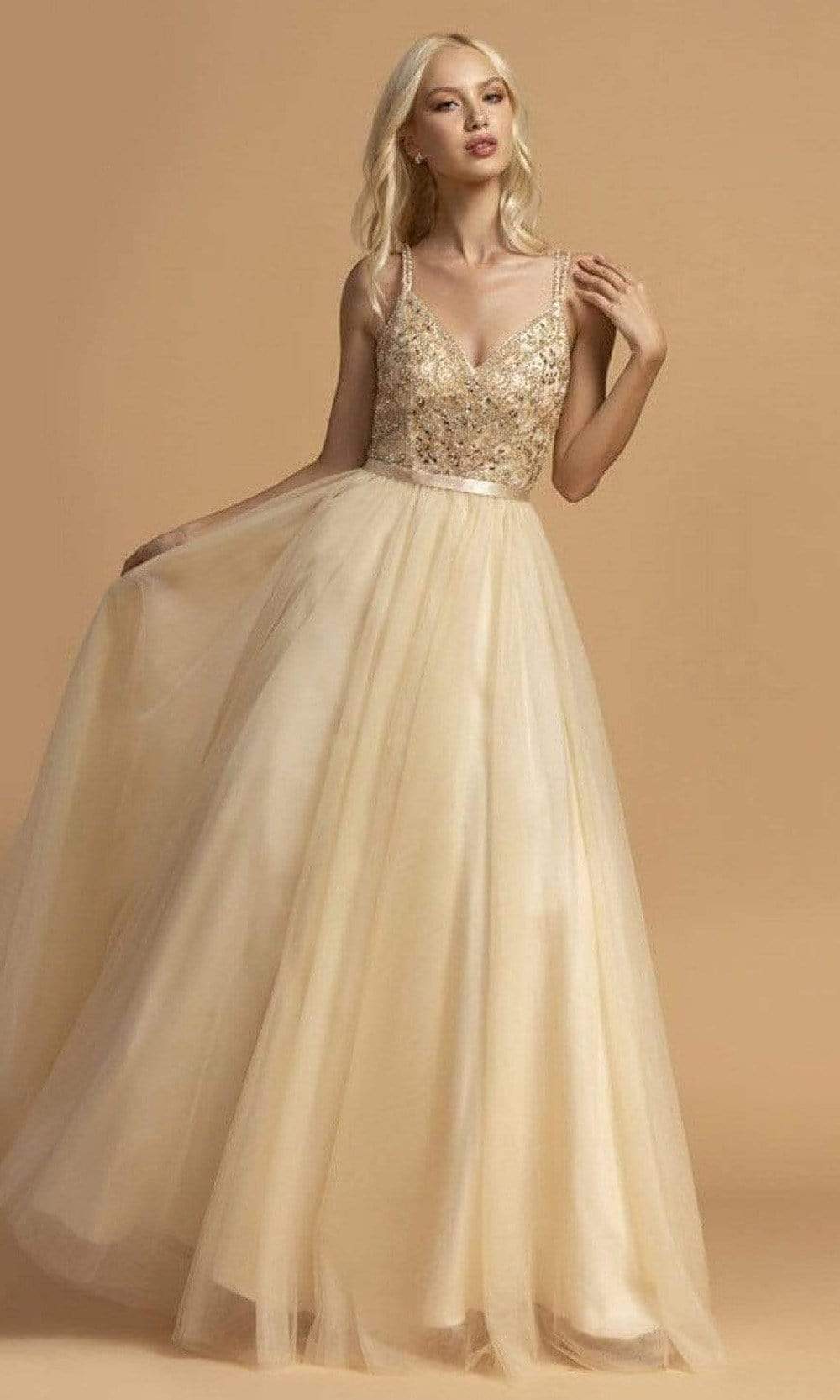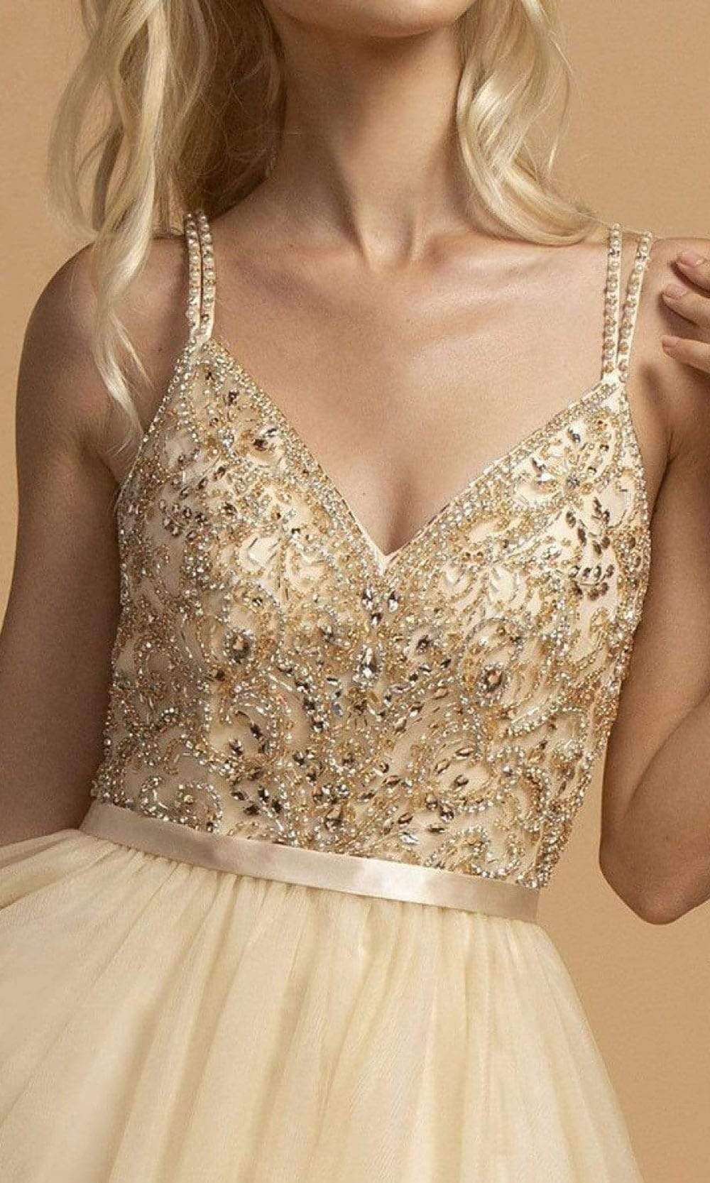 Be the shinniest star of the night when you wear this Trevi Collection L2097 masterpiece. This gown has a beaded sleeveless bodice, this evening gown features a V neckline supported by slender straps. This dress has an A Line silhouette and a V back with a back zipper closure. Browse the collection and get a buzz out of bewitching styles presented by Trevi Collection. Get ready to be the muse of every masterwork with this Trevi Collection L2097 creation. Model is wearing Champagne color.
