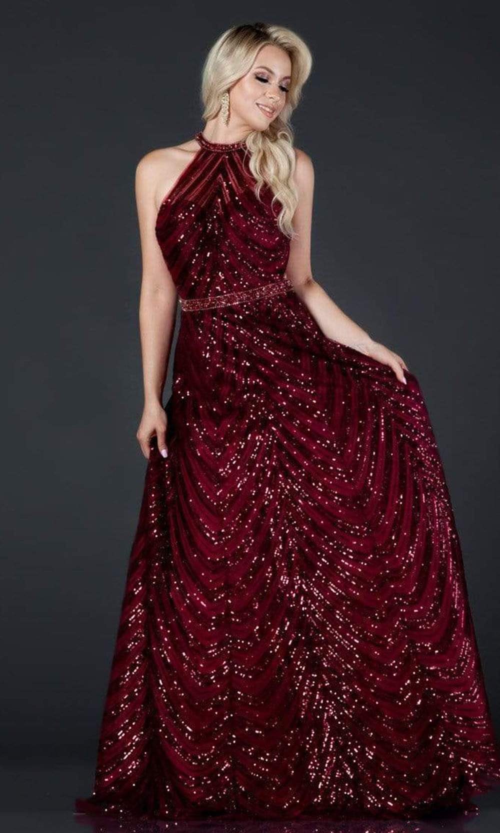 In this Trevi Collection L2377 design, you will absolutely glow with sophisticated glam on your next big event. This gown has a halter neckline and a sequin adorned bodice. This dress has an A line silhouette and an open back with a zipper fastening. This outfit will be a good addition to your wardrobe that you can use in different special occassion. Orchestrate your moment to stand out in this Trevi Collection L2377 work of art. Model is wearing the Burgundy color.