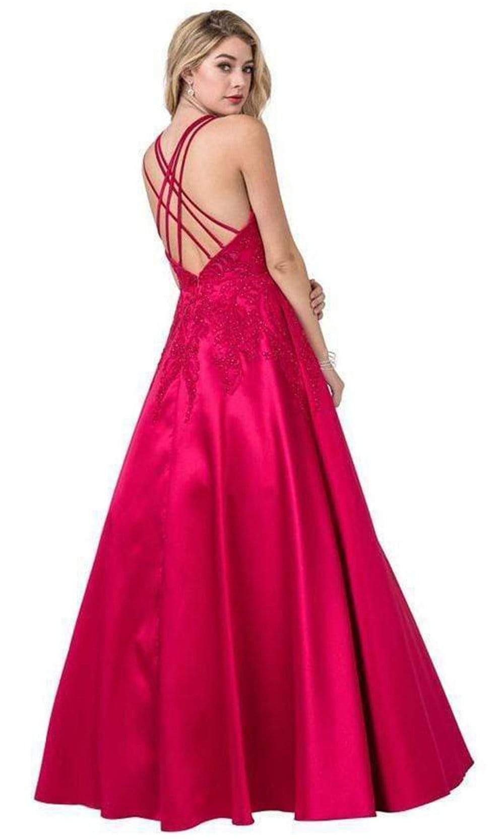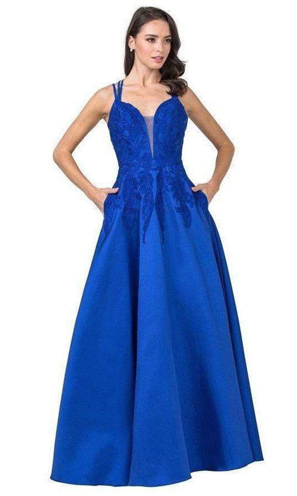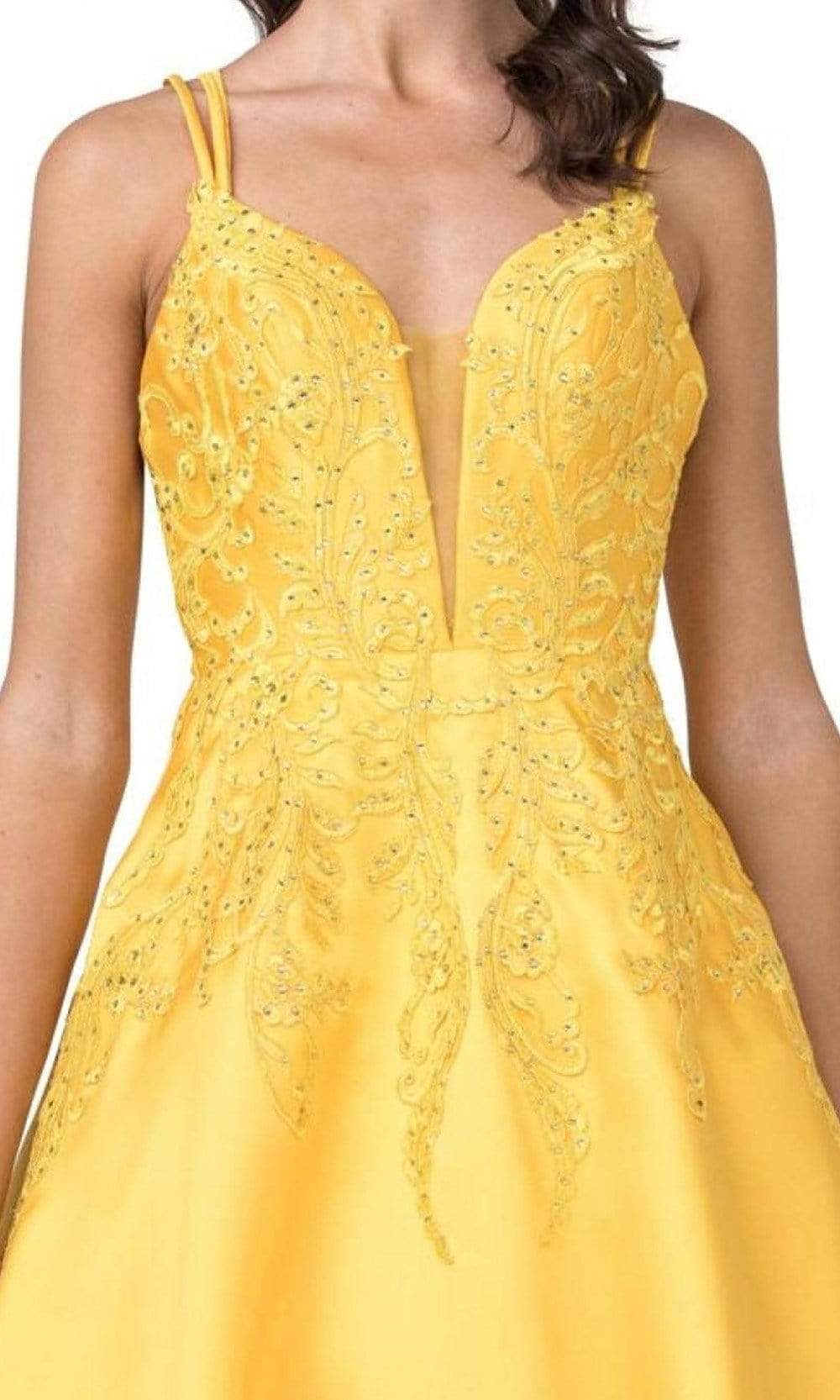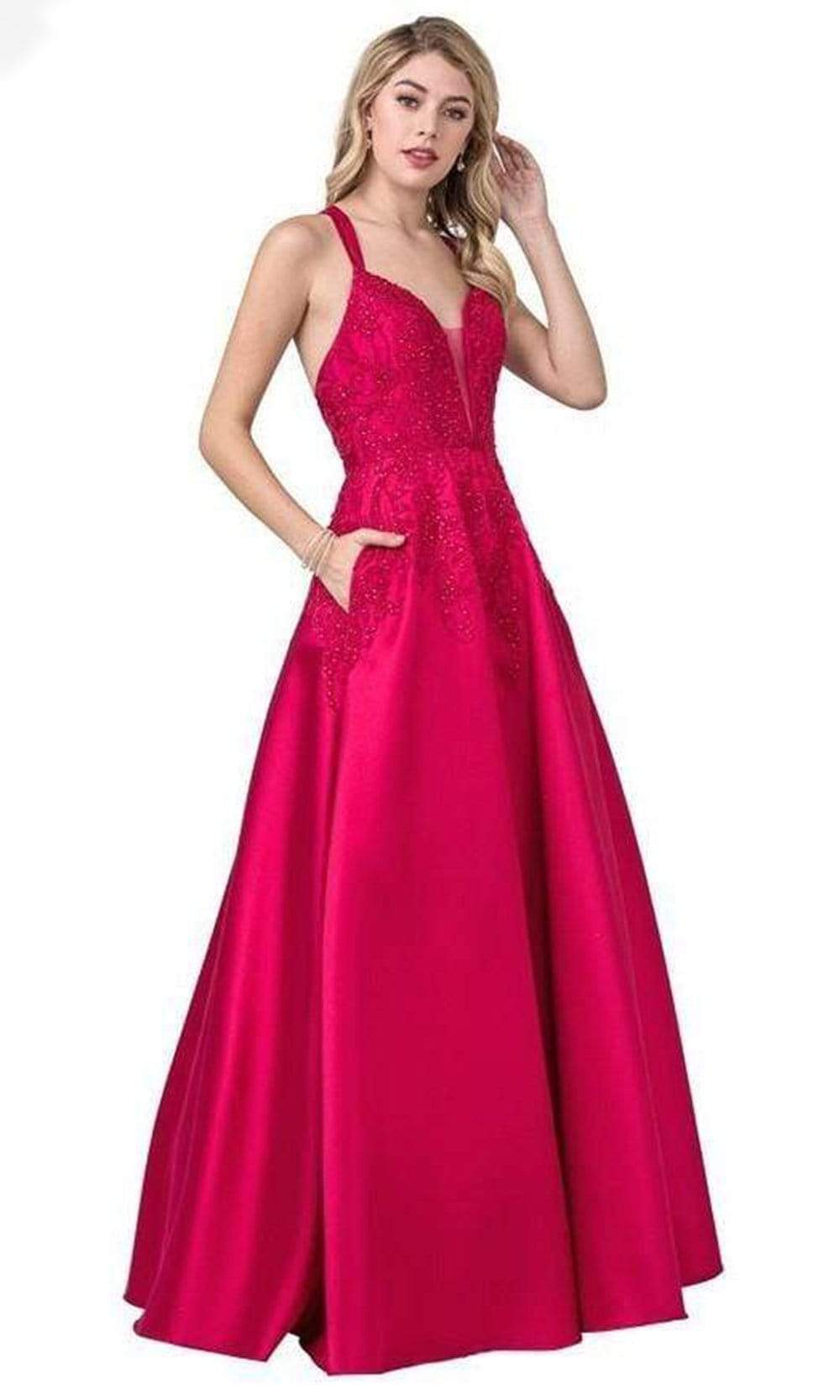 Enter the hall with grace and beauty in Trevi Collection L2401 creation. This lovely dress is decorated with dotted beadwork and embroidery on the bodice that will surely captivate everyone. It has a sheer inset on the plunging v-neckline and a bare back with a strappy design for support. The satin A-line skirt streams beautifully to the full length hem. Fascinate the crowd wearing this exceptional Trevi Collection L2401 masterpiece. Models are wearing the Magenta, Marigold and Royal colors.