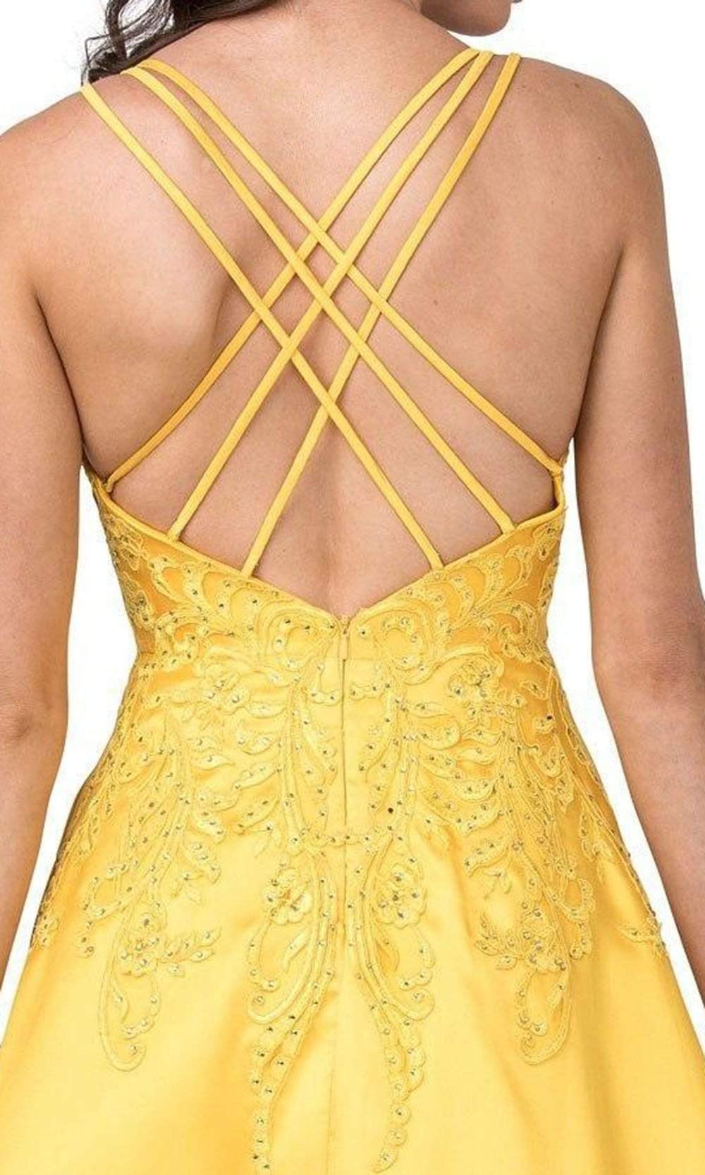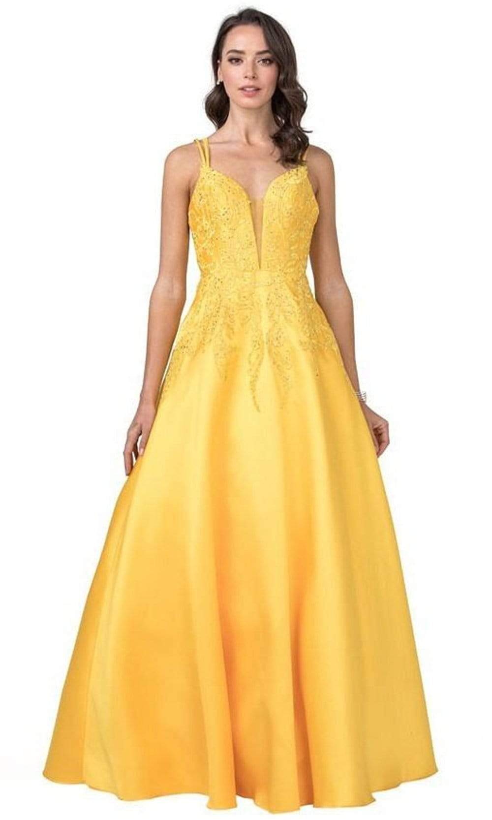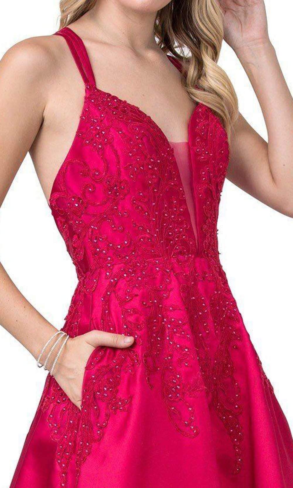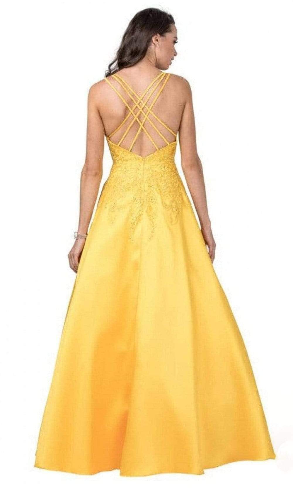 Enter the hall with grace and beauty in Trevi Collection L2401 creation. This lovely dress is decorated with dotted beadwork and embroidery on the bodice that will surely captivate everyone. It has a sheer inset on the plunging v-neckline and a bare back with a strappy design for support. The satin A-line skirt streams beautifully to the full length hem. Fascinate the crowd wearing this exceptional Trevi Collection L2401 masterpiece. Models are wearing the Magenta, Marigold and Royal colors.