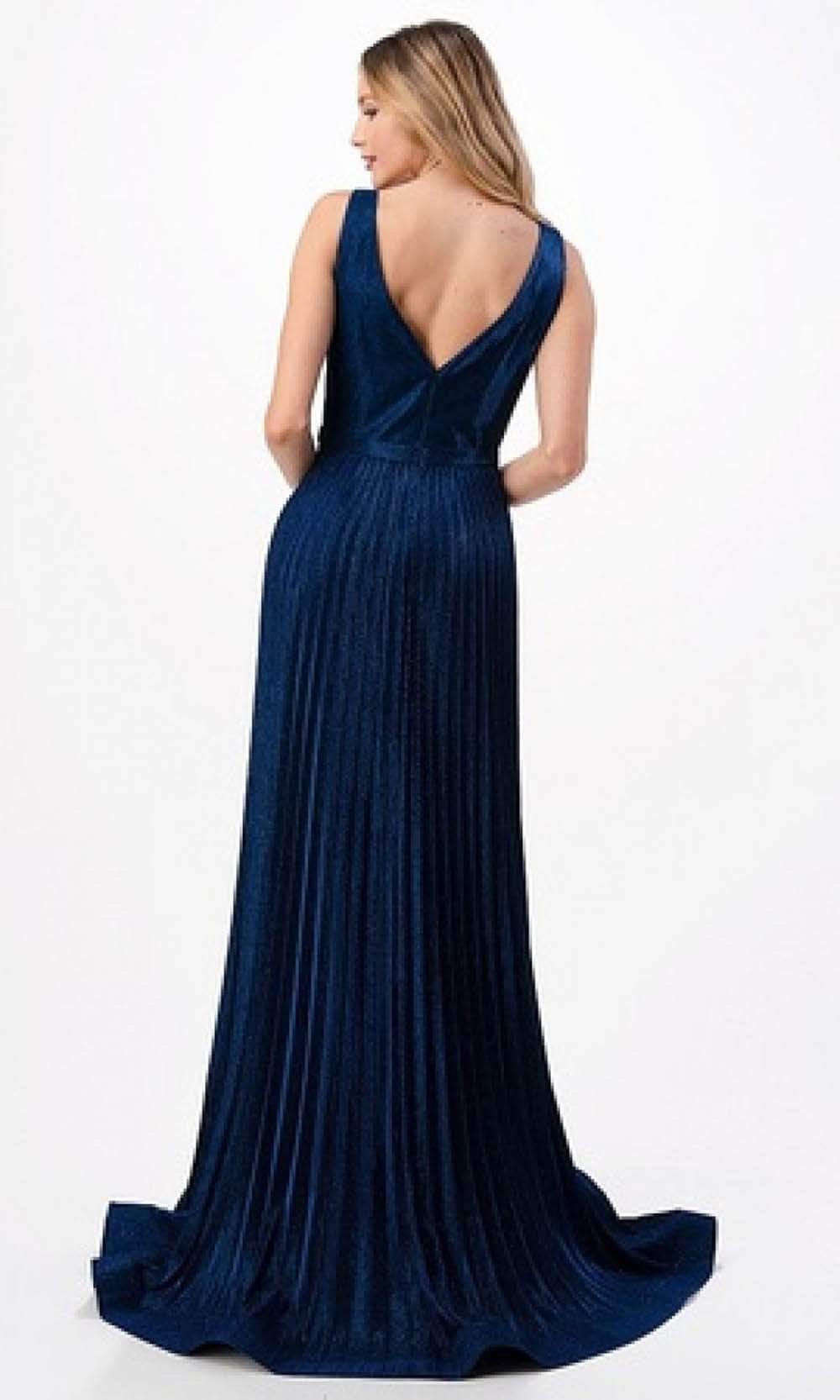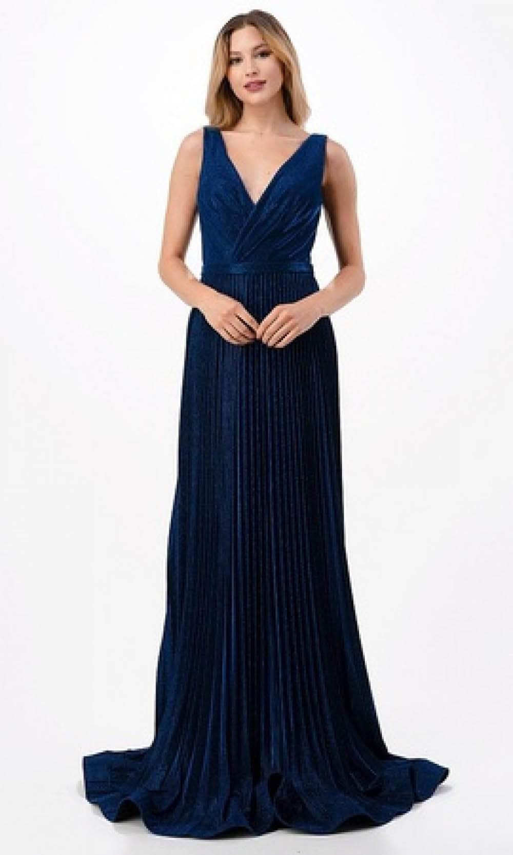 In this amazing design by Trevi Collection L2714, embrace a fantastic evening. Made of glittered fabric, this ethereal beauty is sleeveless. displaying a deep v-neckline, wide shoulder straps, and a ruched surplice bodice. A center zipper closure fastens the v-shaped cut at the back, which imitates the front. The A-line skirt is exquisite with its pleated detail, flowing gracefully into a full-length hemline and sweeping train. You'll feel very special wearing this Trevi Collection L2714 dress! Model is wearing the Navy color.