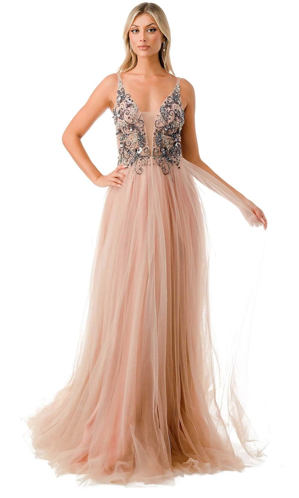 When you wear this glitzy Trevi Collection L2781A creation, you'll want to be the belle of the ball. This stunning piece features a plunging v-neckline with an illusion inset and is fascinatingly adorned with shimmering beadwork in an intricate motif. Featuring a sleeveless bodice and an embellished low v-open back, the dreamily layered skirt descends to the floor in a fluffy train, revealing a seductive slit. With this masterwork by Trevi Collection L2781A, you'll have the audience in stitches. Models are wearing the Smokey Blue and Mauve colors.