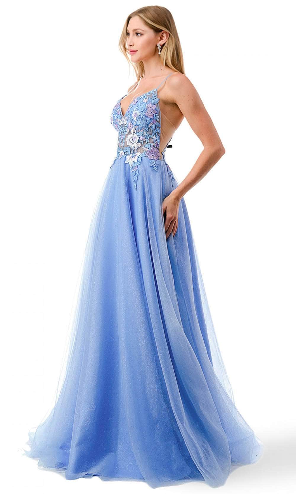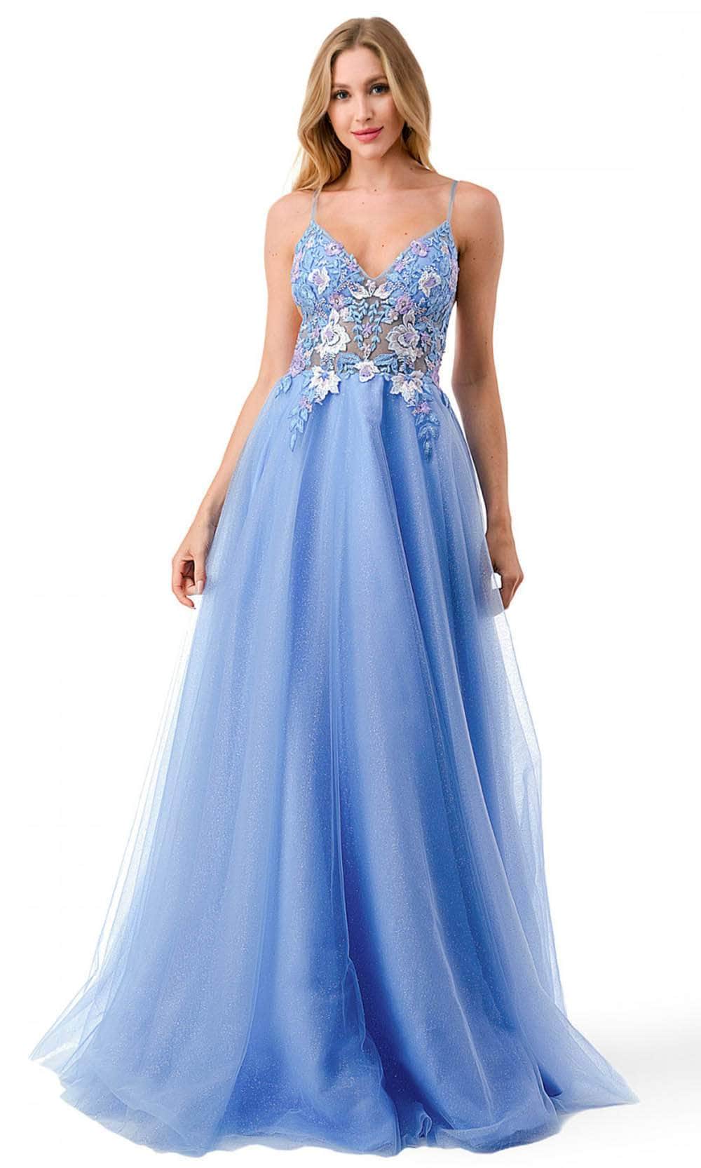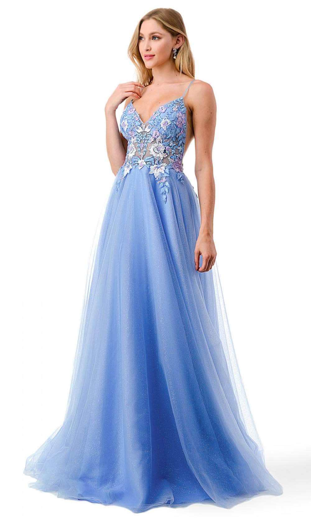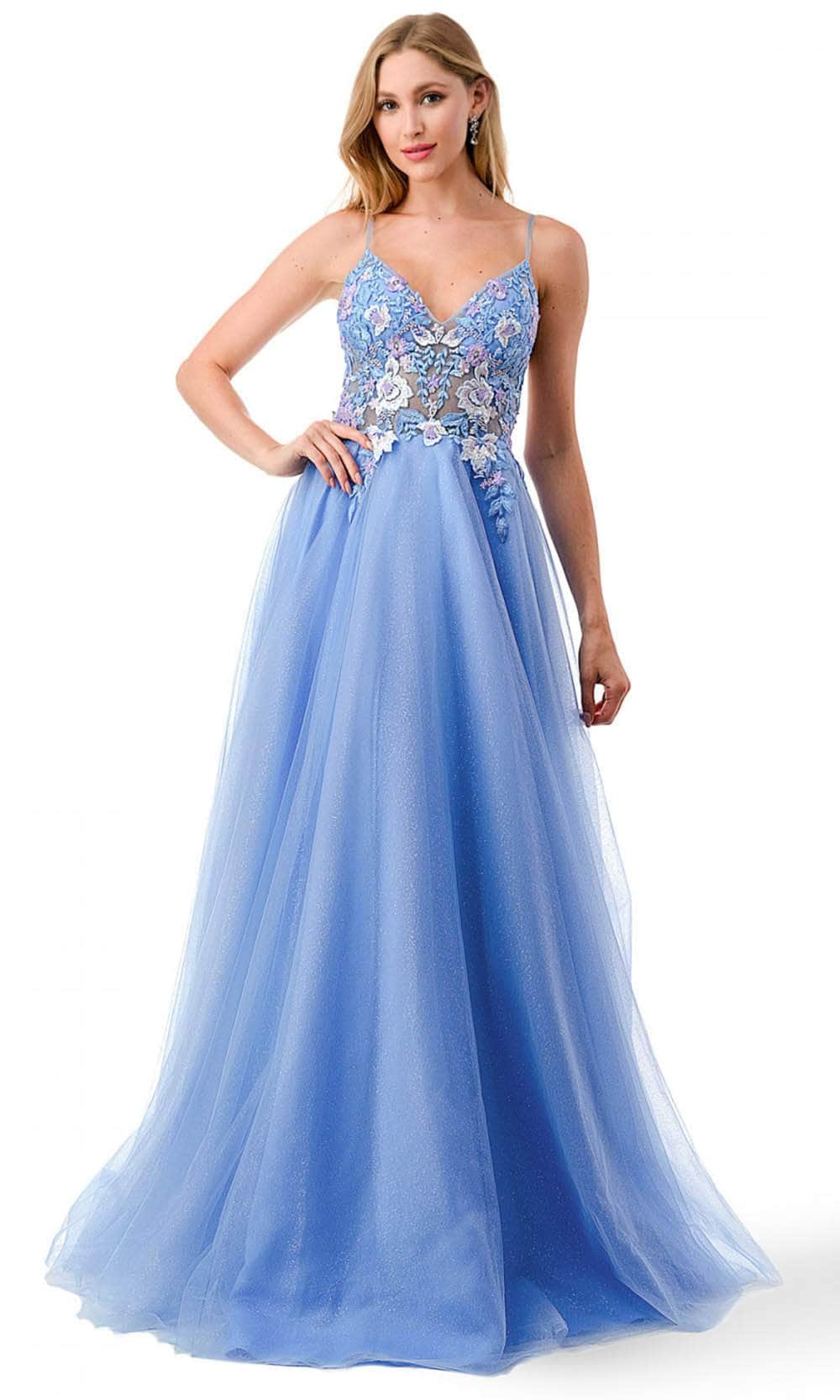Trevi Collection L2792T is a stunning dress that exudes elegance and femininity. Get ready to steal the show. The sleeveless bodice radiates enchanting beauty because of the beautiful floral lace appliqué. A touch of allure is added by the delicate, thin straps supporting the plunging V-neckline. A center zipper closure and open back guarantee a perfect fit, while a side mesh panel creates a captivating illusion. The full-length A-line silhouette finishes with a sweeping train that adds a sense of grandeur and drama. It cascades gracefully, enabling you to dance with ease and elegance. The Trevi Collection L2792T exudes a charming, ethereal aura. Model is wearing Perry Blue color.