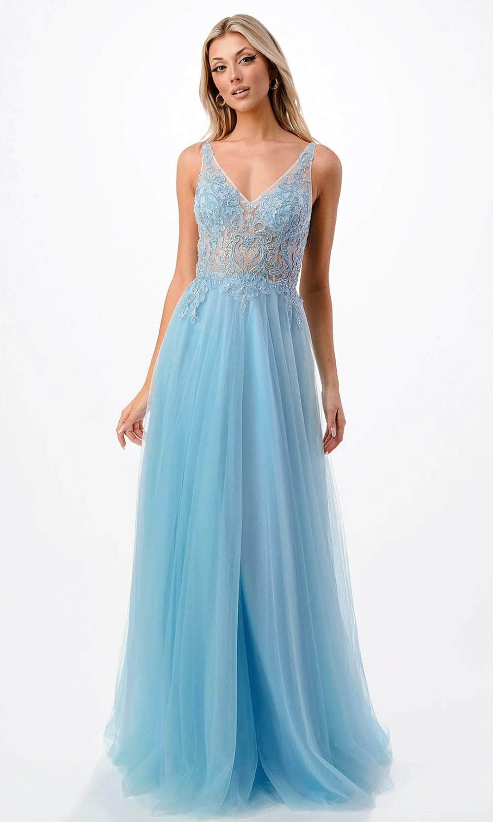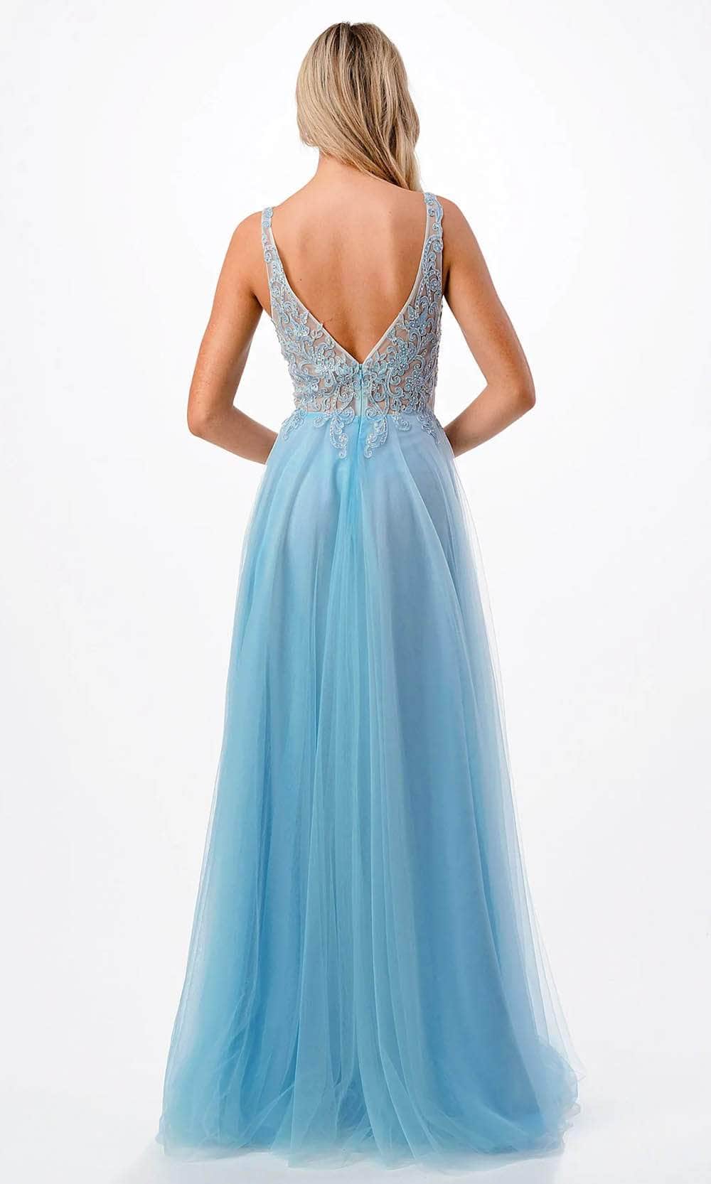 Wear this alluring Trevi Collection P2108 creation to your opulent event to unleash your inner charmer. The captivating illusion bodice of this sleeveless masterpiece is embellished with stunning rhinestones and lace appliques in the shape of scrolls. The v-open back adds a hint of sensuality and allure, while the v-neckline gracefully accentuates your décolletage. With its zipper closure for a smooth fit, the tulle skirt cascades beautifully, creating a dreamy, ethereal train that sweeps behind the ensemble. In this Trevi Collection P2108 masterpiece, you can become a vision of charm and elegance. Model is wearing the Light Blue color.