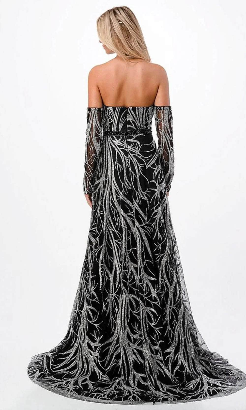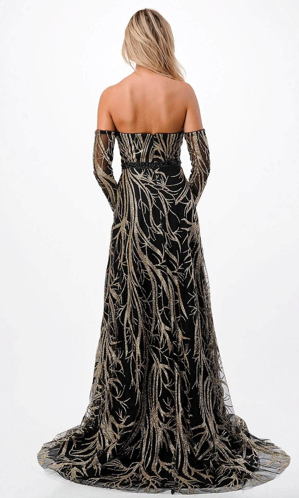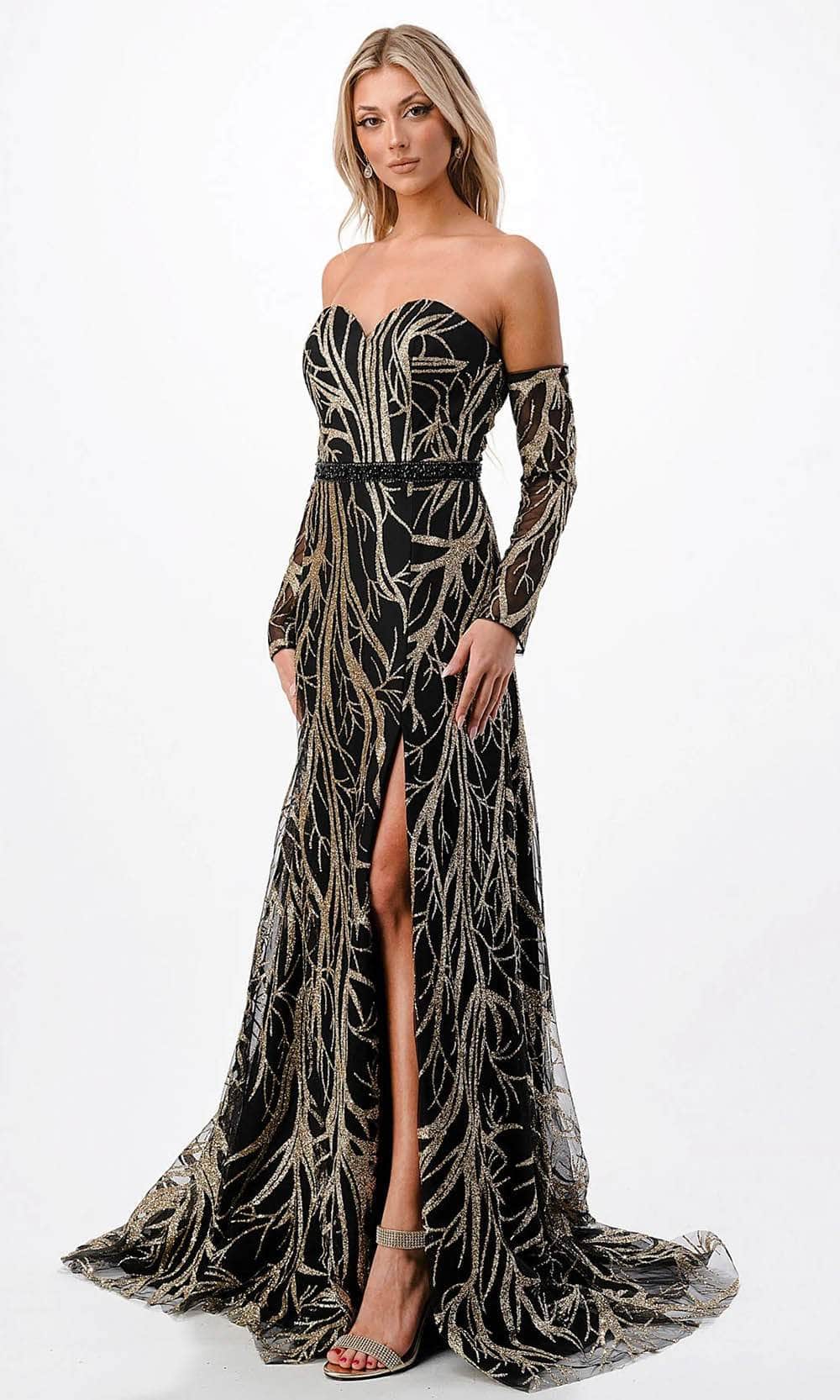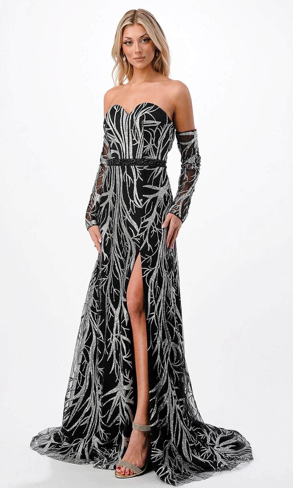 Wearing this Trevi Collection P2304 creation, you'll experience an unmatched level of grace and elegance at your next event. With a sweetheart neckline and a strapless bodice, this exquisite ensemble captures a mesmerizing glitter print spectacle on a tailored silhouette. With its elegant beaded waist and midrise back, this beauty accentuates your curves with a zipper closure. You can easily switch up your appearance thanks to the long sleeves' detachable design. With every step, the A-line skirt trails behind you and features a high slit before ending in a sweep train. Wear this magnificent Trevi Collection P2304 masterpiece with an elegance that speaks volumes. Models are wearing the Black/Gold and Black/Silver colors.