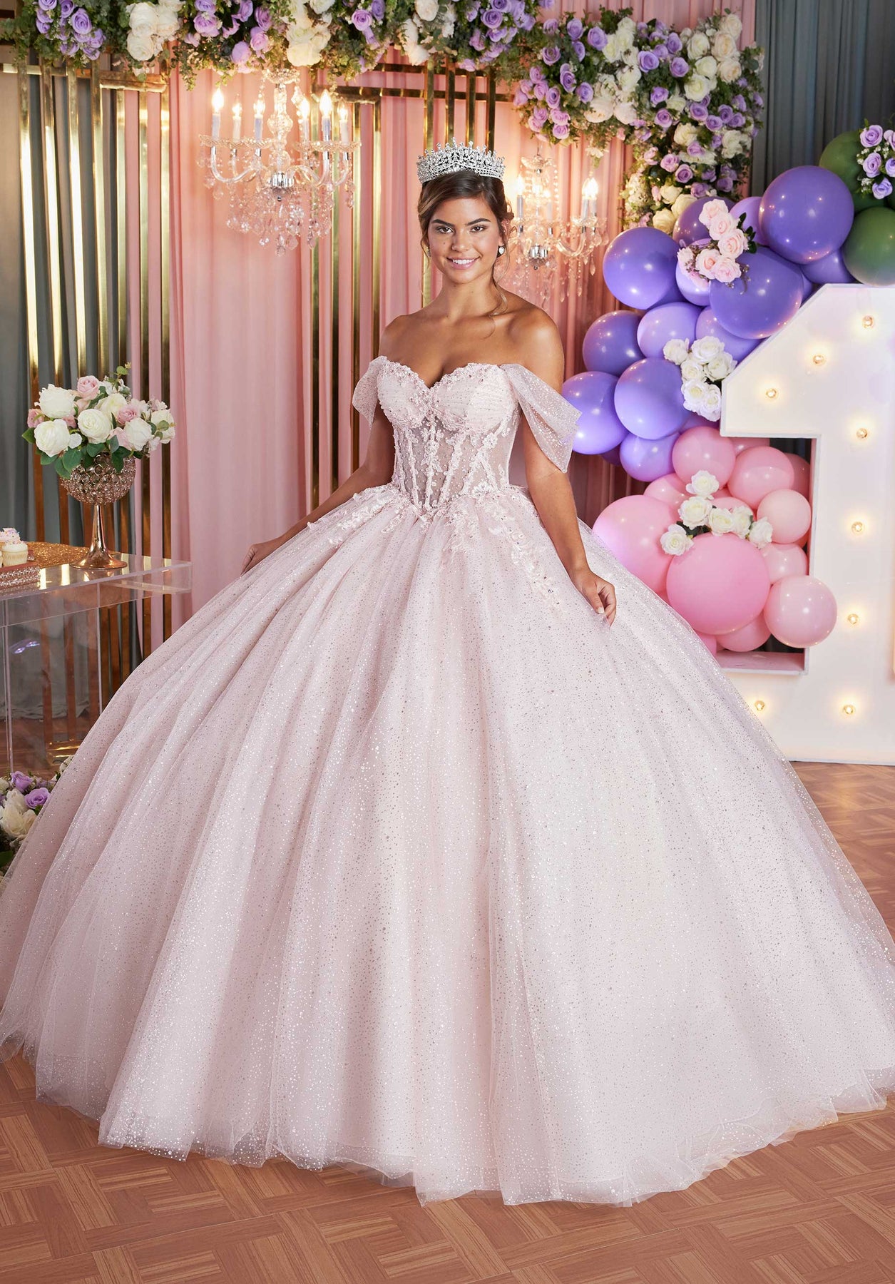 Grace and grandeur define Vizcaya by Mori Lee 89502, designed in glitter tulle for maximum radiance. Its sheer corset bodice is richly detailed with beaded and lace appliques that frame the sweetheart neckline and Basque waist. Detachable off-shoulder sleeves provide styling flexibility, while the voluminous ballgown skirt cascades into a tiered ruffle back and sweep train for a striking finish. A lace-up closure at the back adds refinement. This Vizcaya by Mori Lee 89502 gown captures a flawless blend of glamour, elegance, and youthful charm. Models are wearing Blush, and Regal Royal colors.
